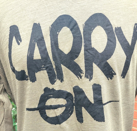 SIZE XS C&A CLOCKHOUSE KHAKI 3/4 SLEEVED 'CARRY ON' GRAPHIC TOP