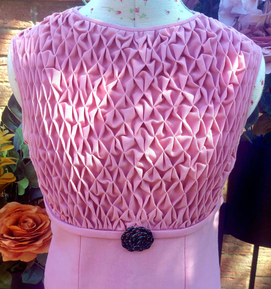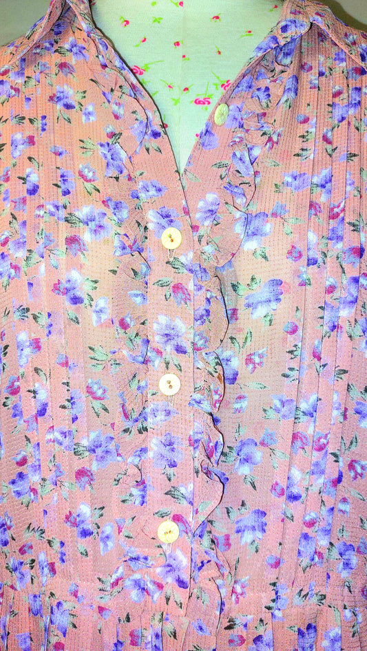 PINK SHEER DRESS WITH PURPLE FLOWERS, PLEATED AND BUTTON DESIGN