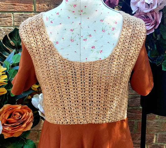 RUSTY CROCHET KNITTED AND SILKY SHORT SLEEVED FIT AND FLARE DRESS