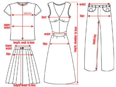 Vintage clothing often does not have sizes due to age and wear, or if they do, they are generally different to the modern sizes that we know now. The sizes will be listed when it is possible, but also full measurements will be given too. All the clothing is measured flat, see diagram below for how the measurements are completed. The bust/chest/waist/hips are measured then doubled.