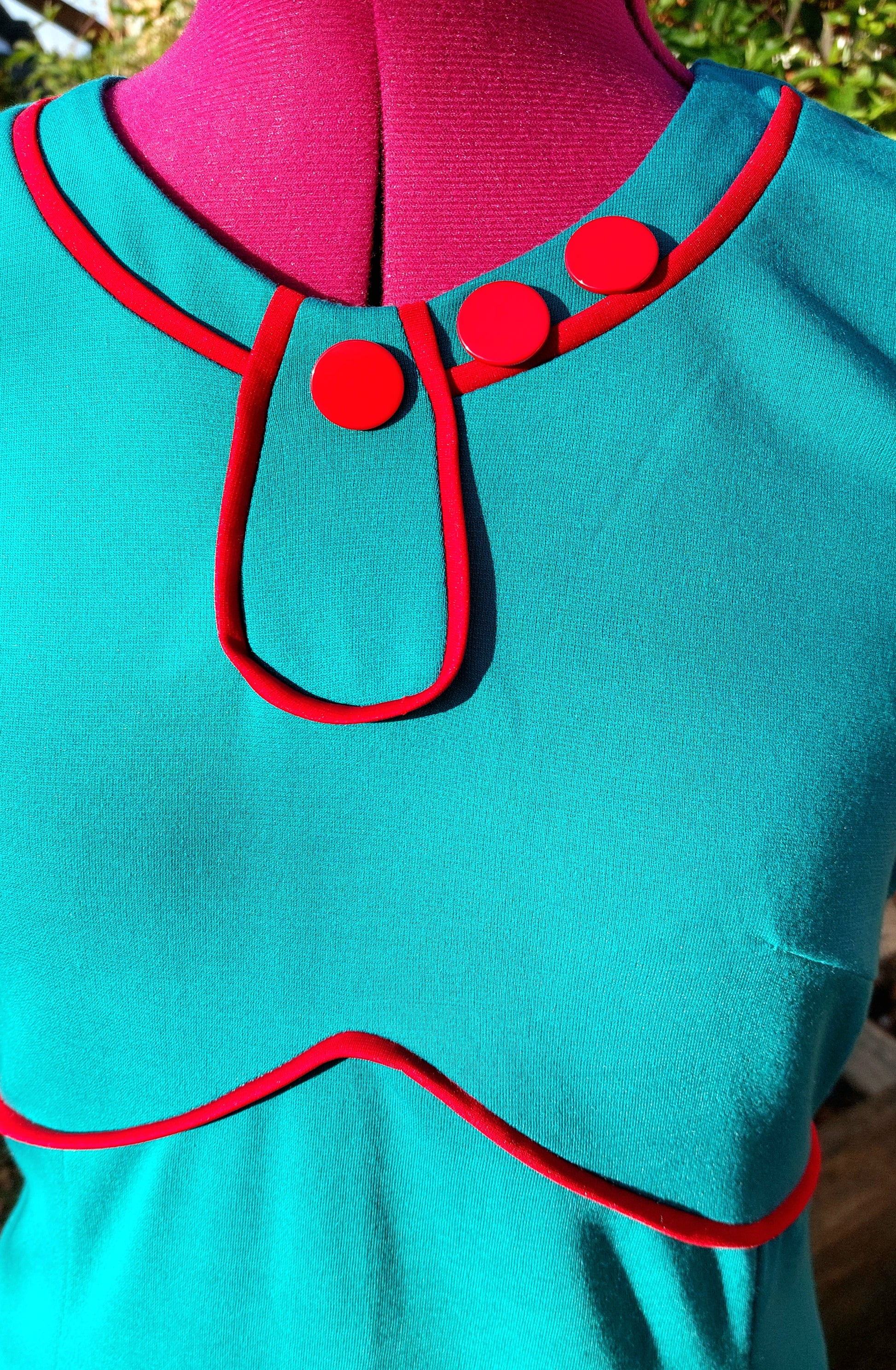Red button and teardrop detail to scoop neckline. Red piping to sleeves and under bust.
