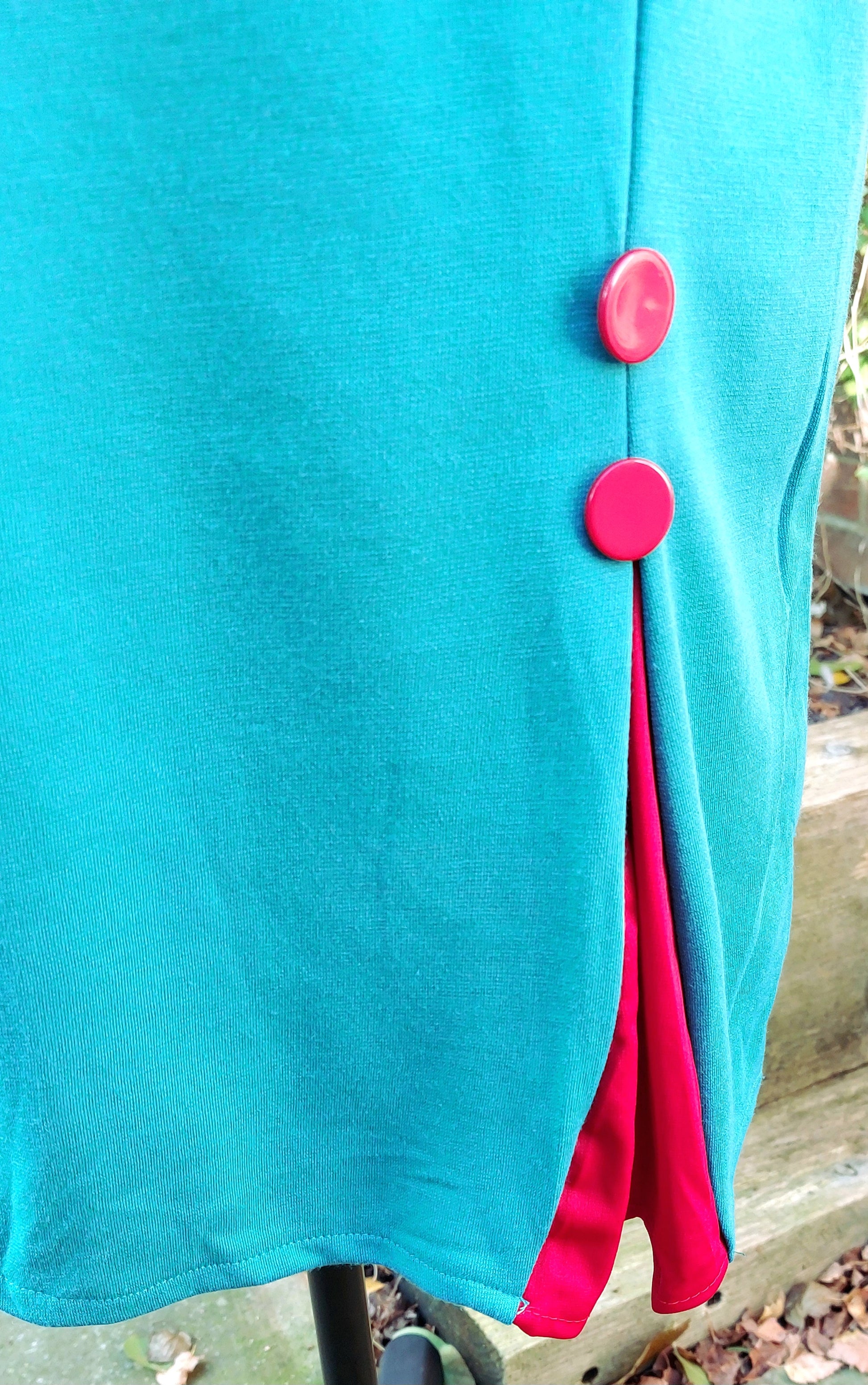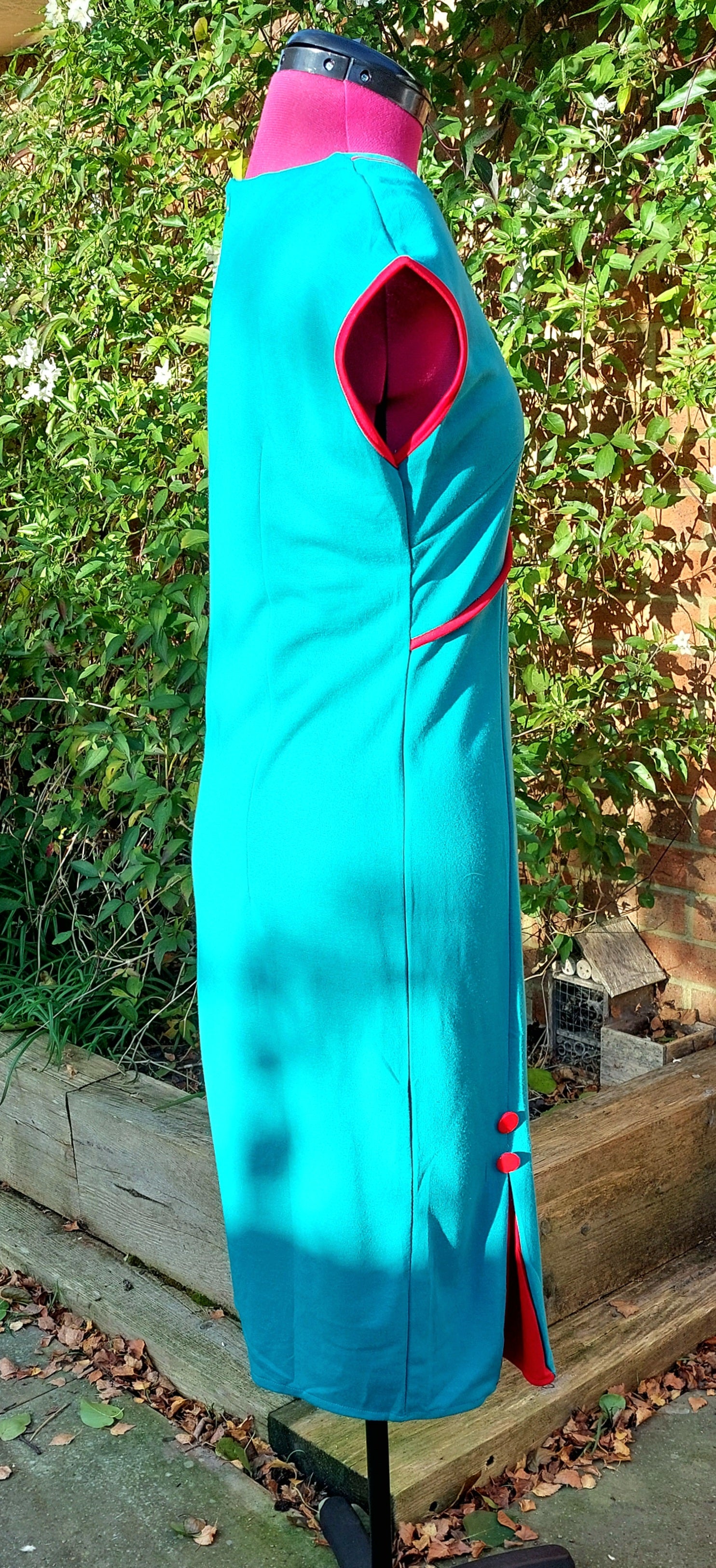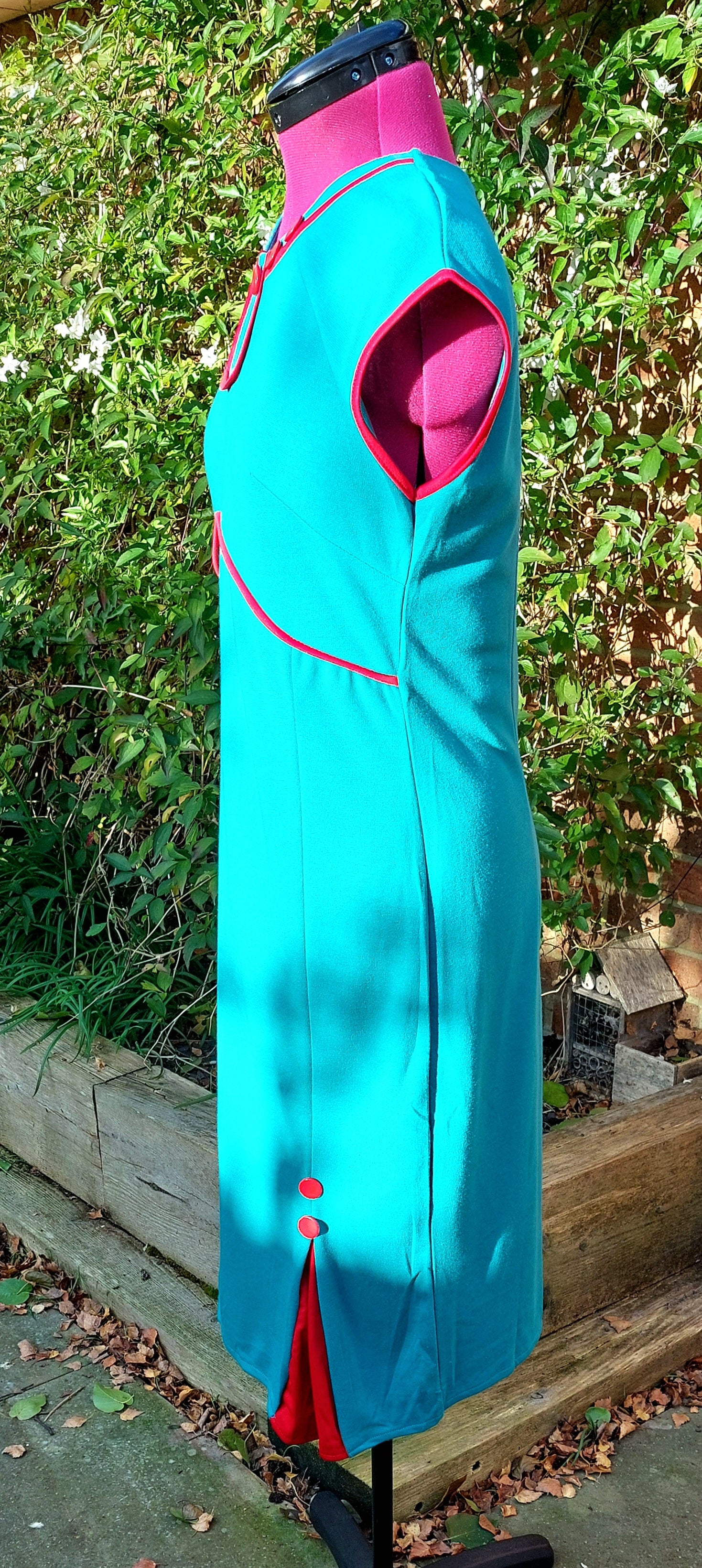 Red button and darts to bottom of skirt. Zip to rear.