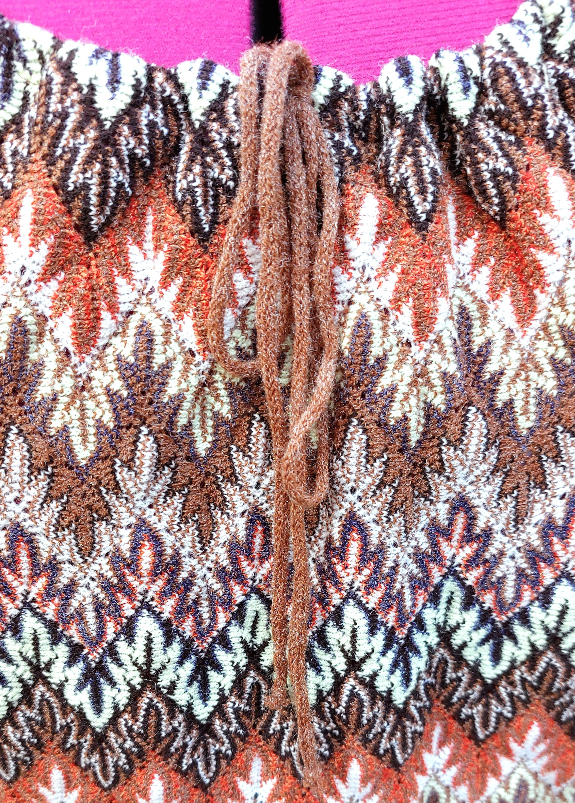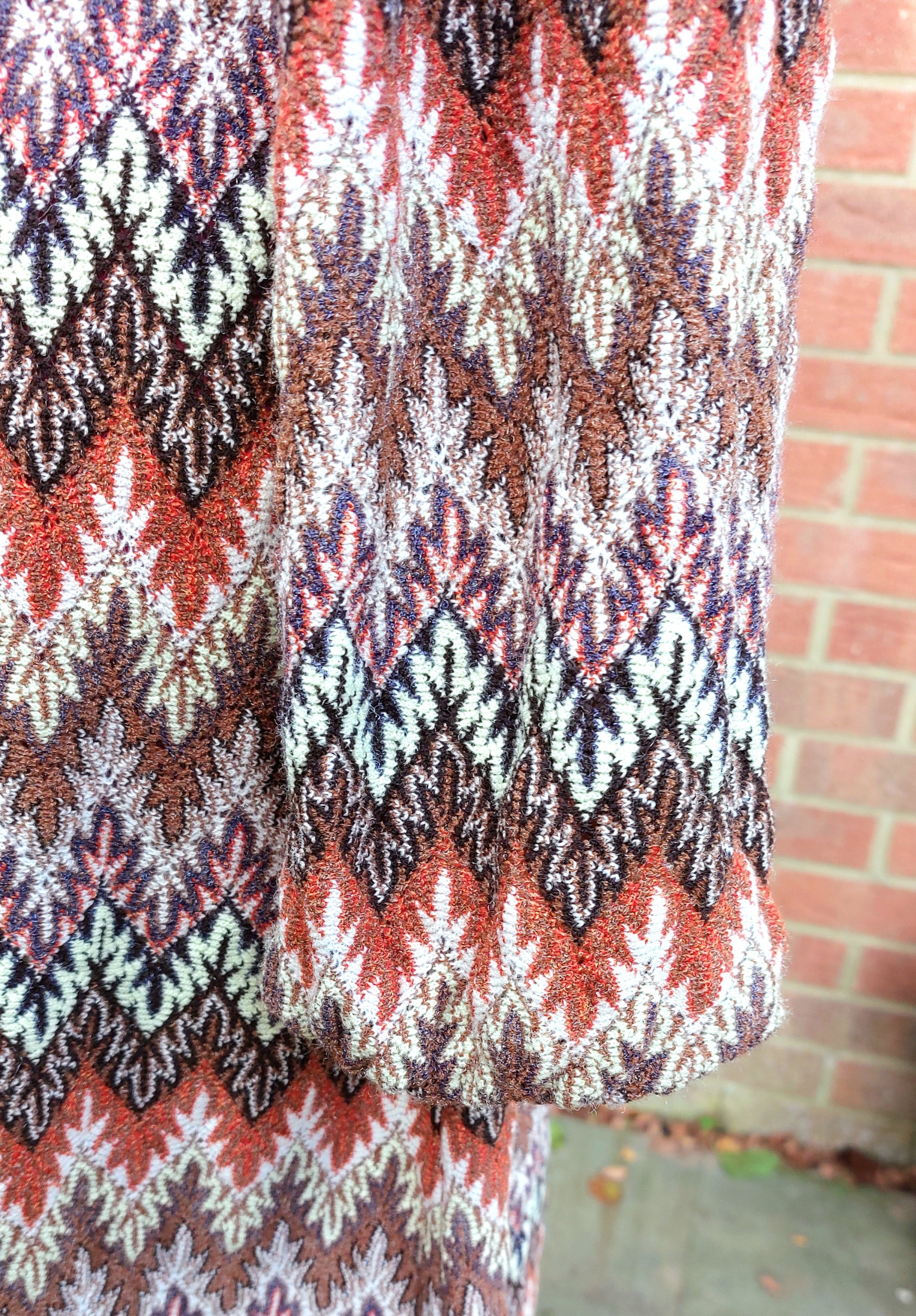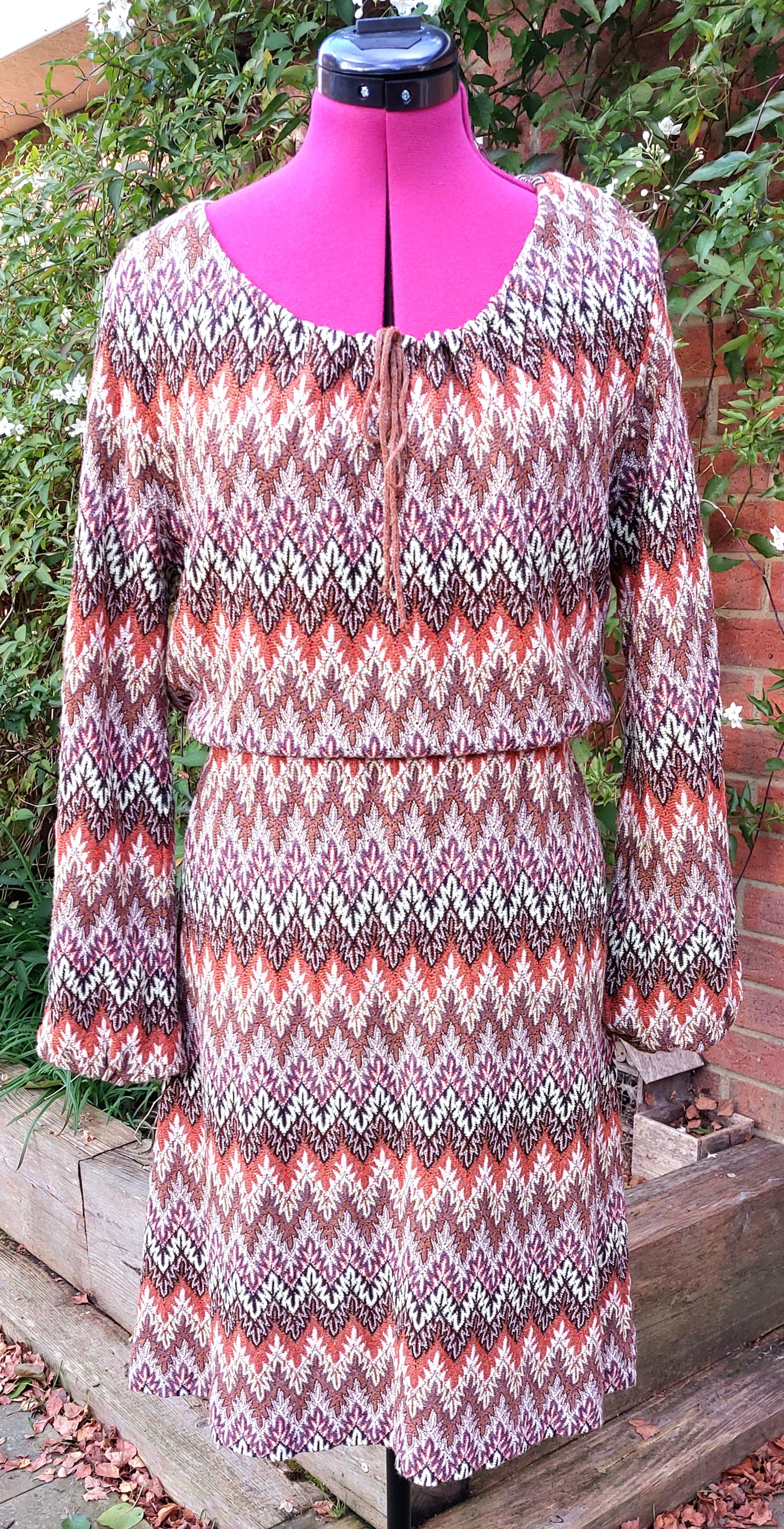 Beautiful multi patterned dress in crochet style. Hues of browns and pinks in a zig-zag leaf like pattern. Thread has a shimmer to it.