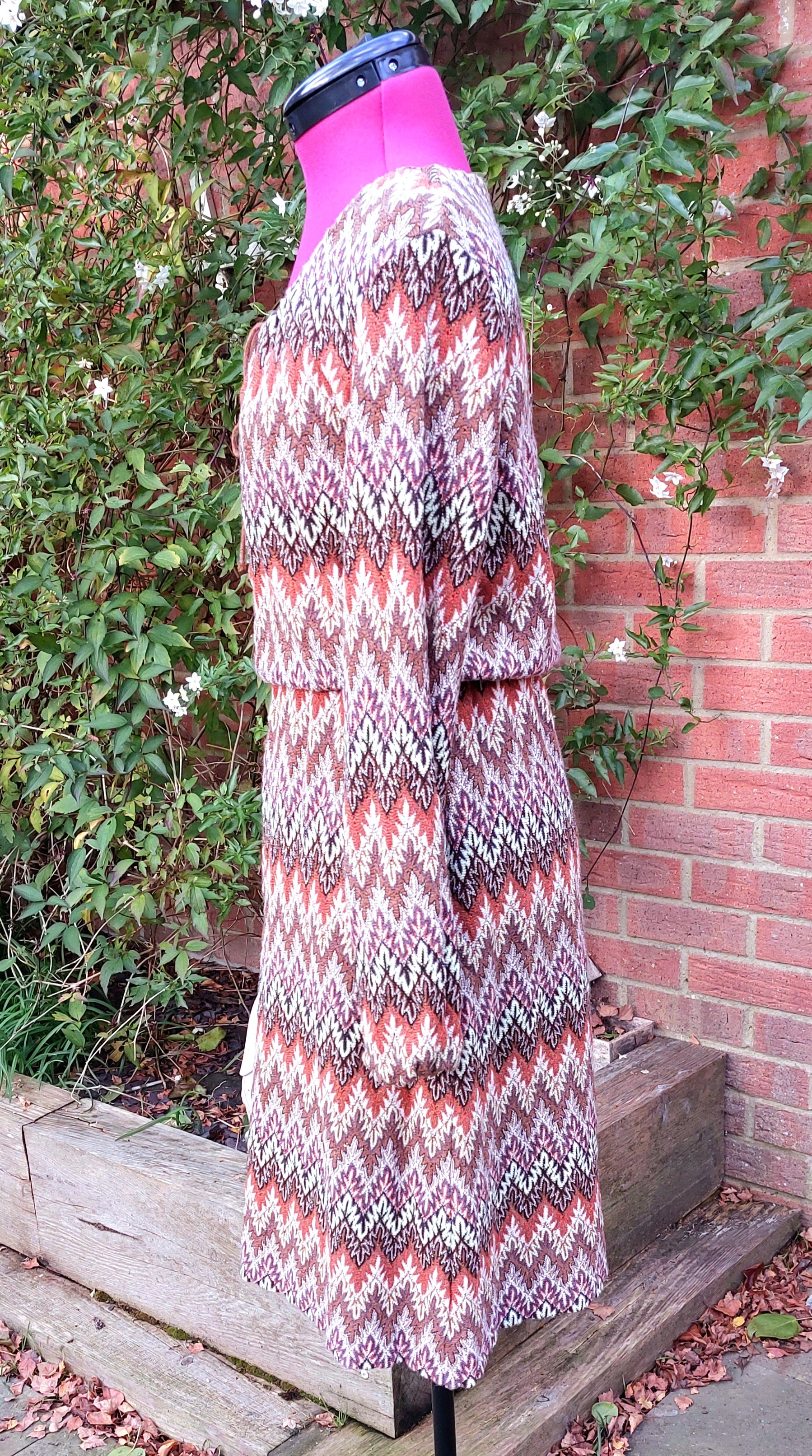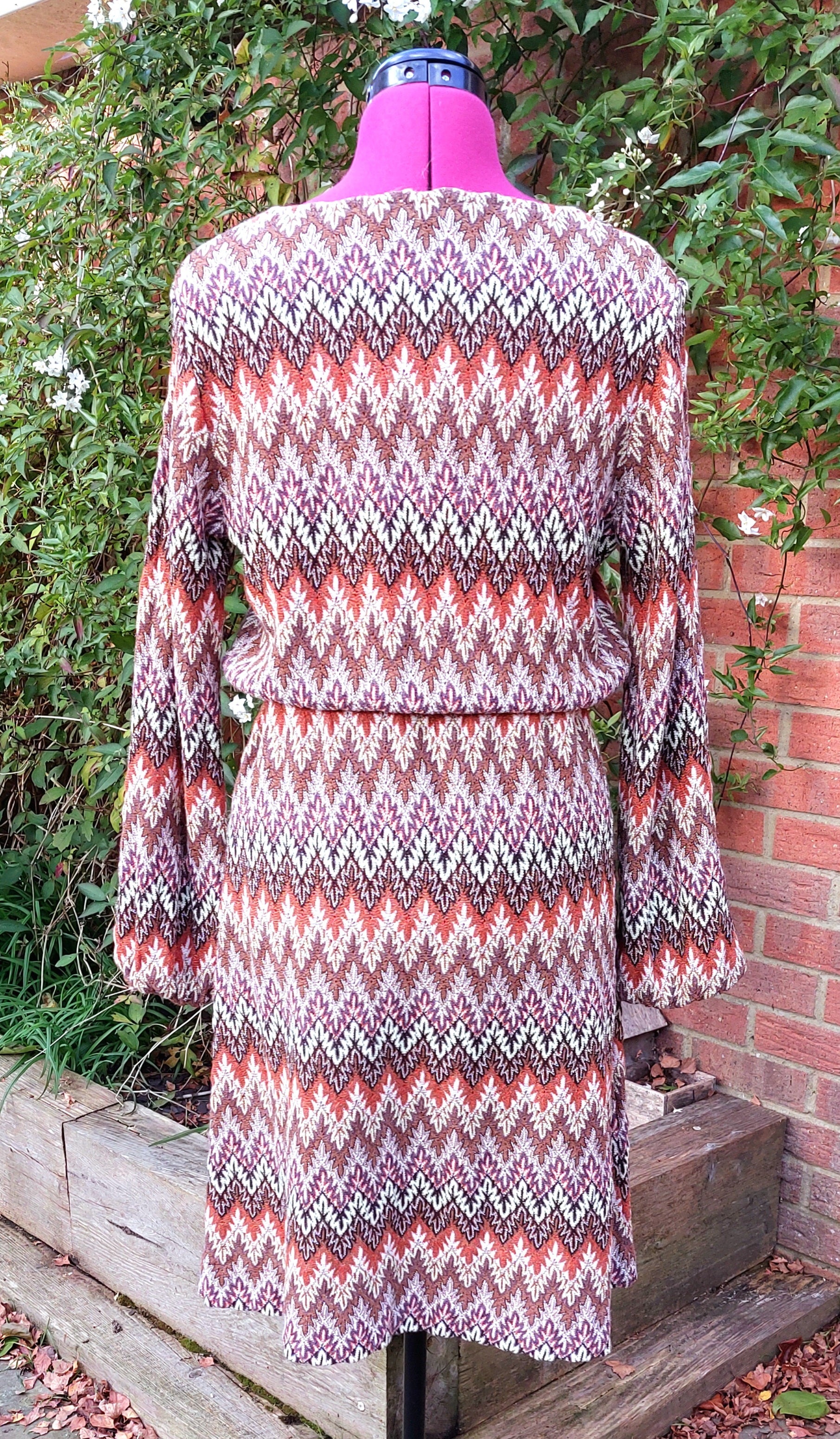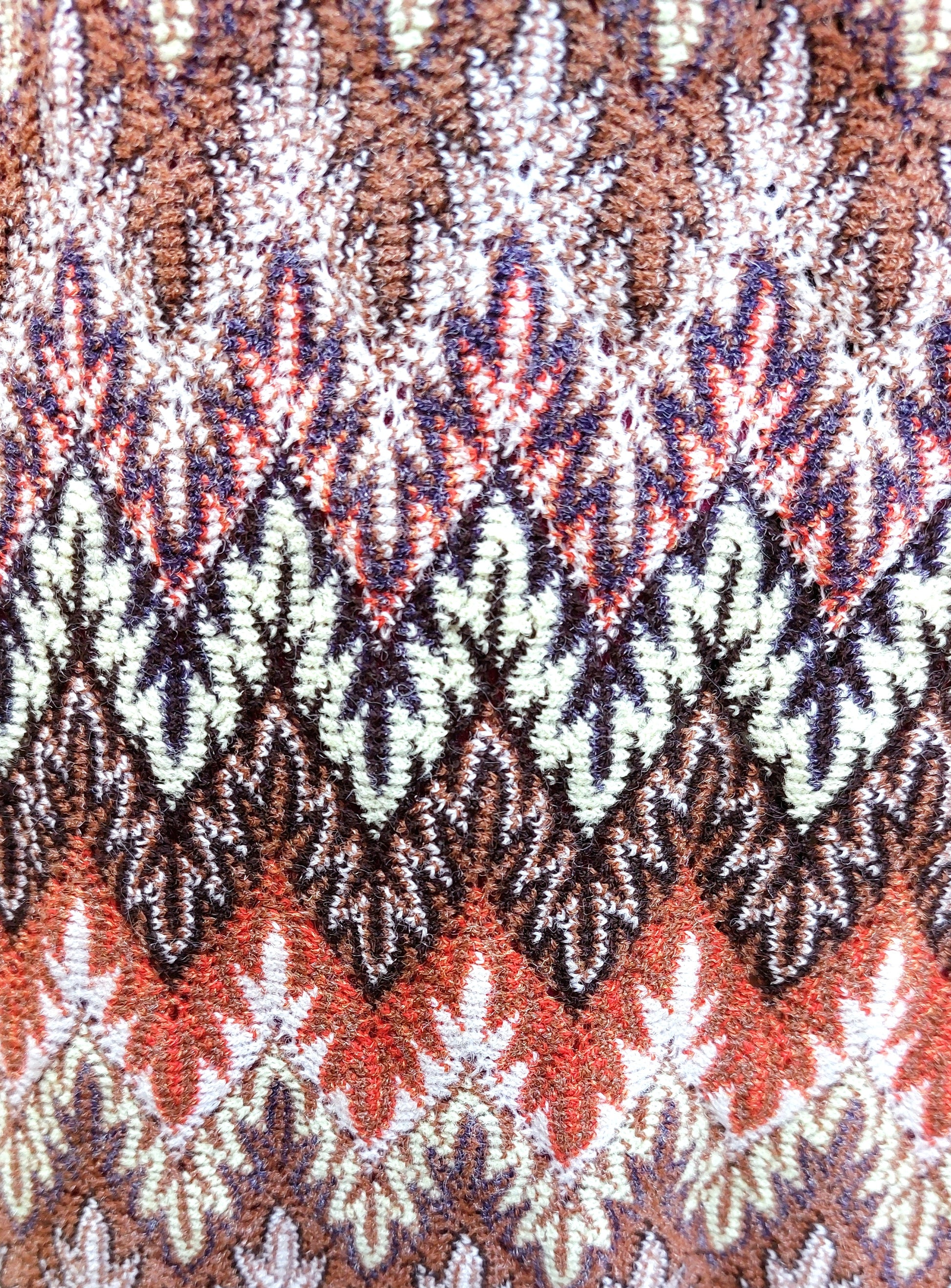 Beautiful multi patterned dress in crochet style. Hues of browns and pinks in a zig-zag leaf like pattern. Thread has a shimmer to it.