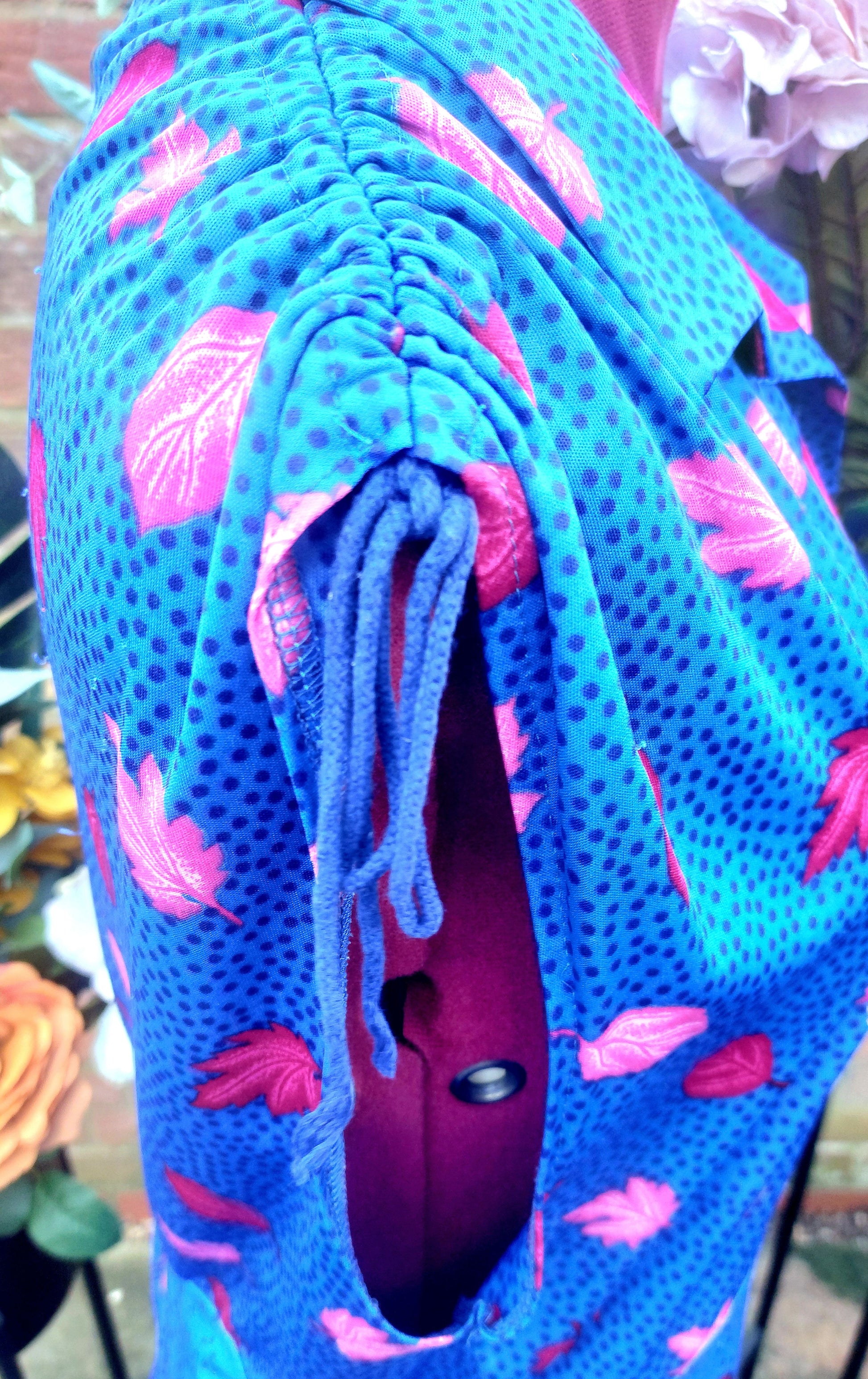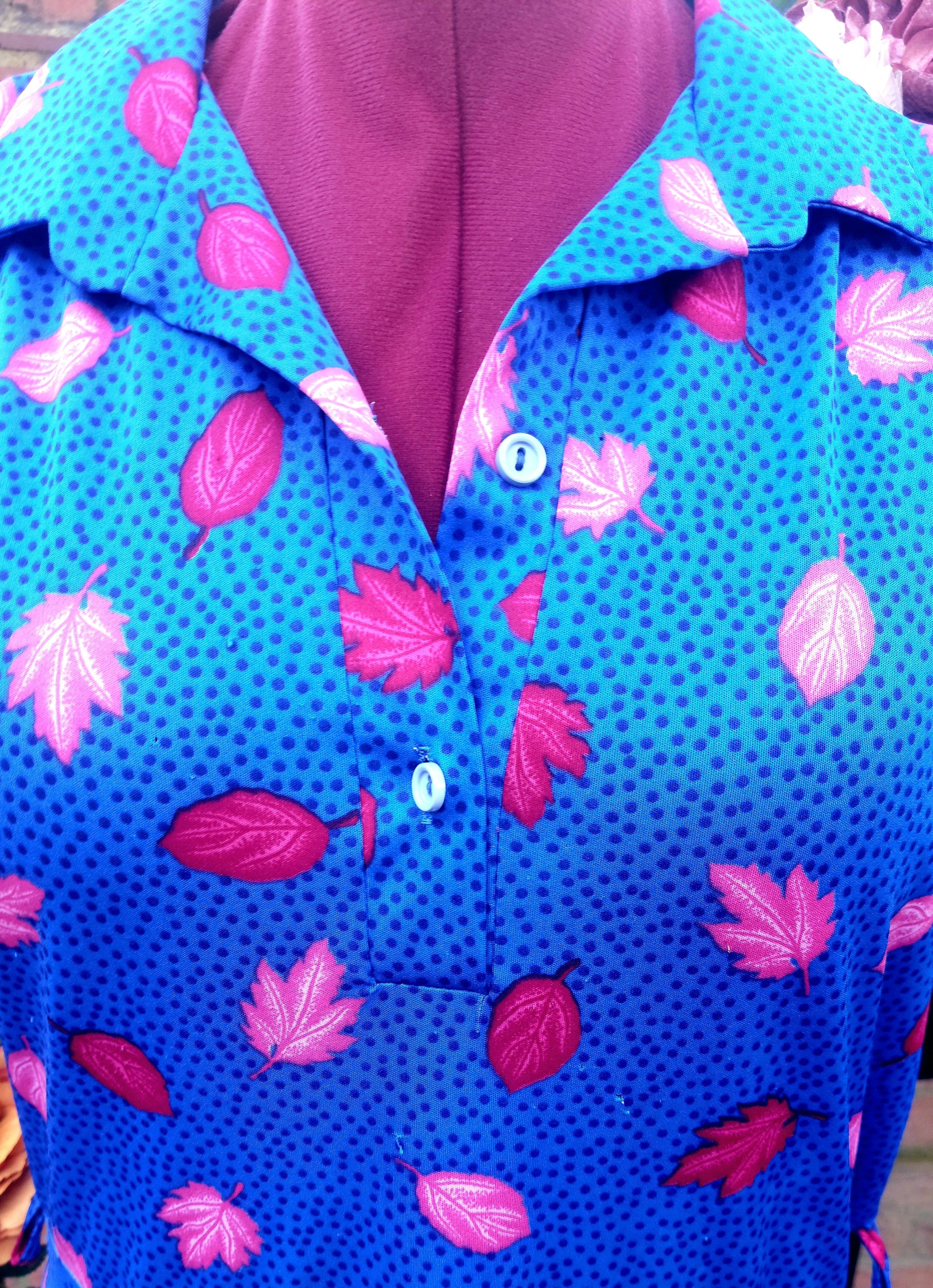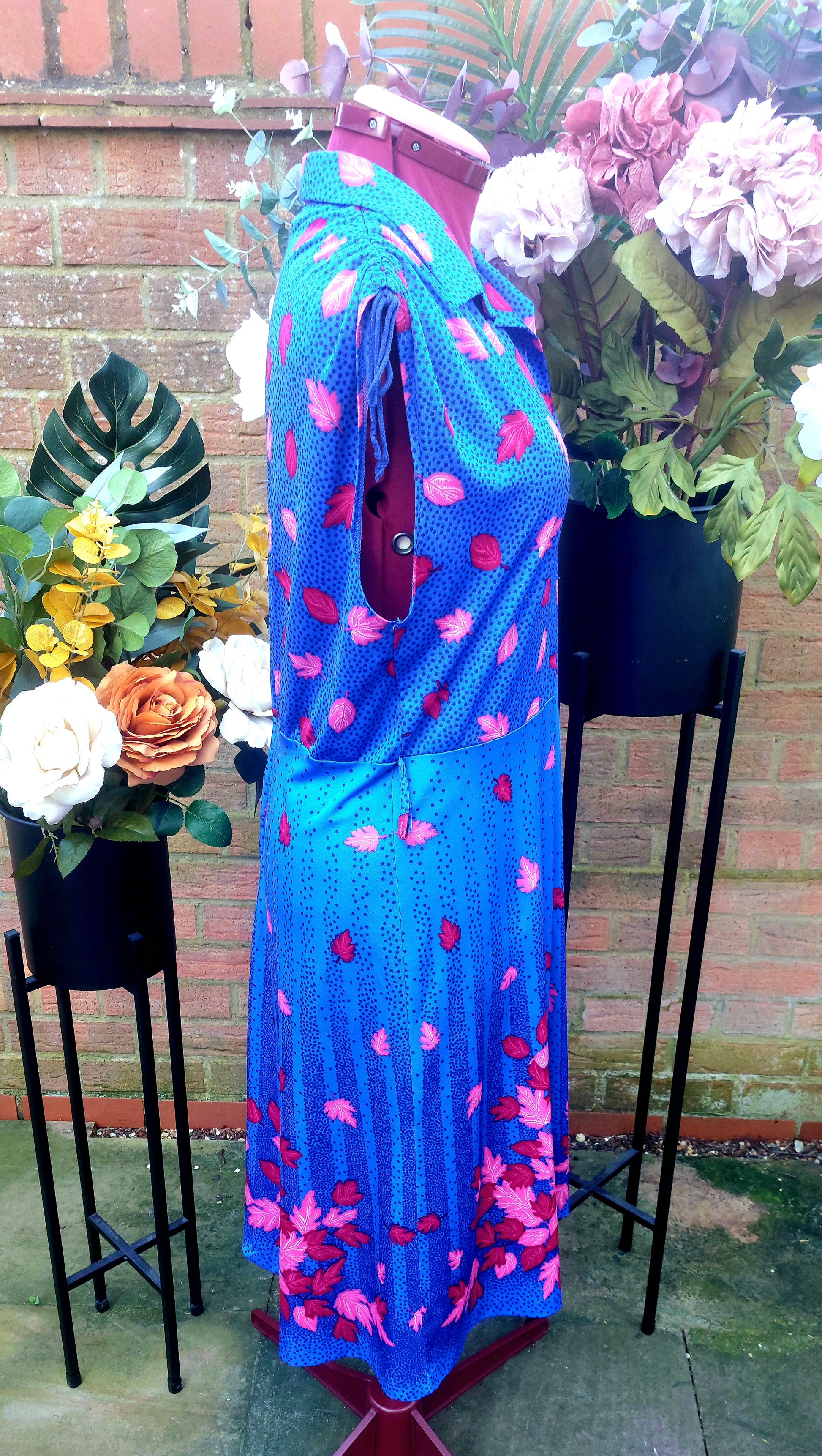 Bold and bright royal blue tea dress with pink leaves. Collared and blue buttons to the front. Capped sleeves with gathered rope ties on shoulders.