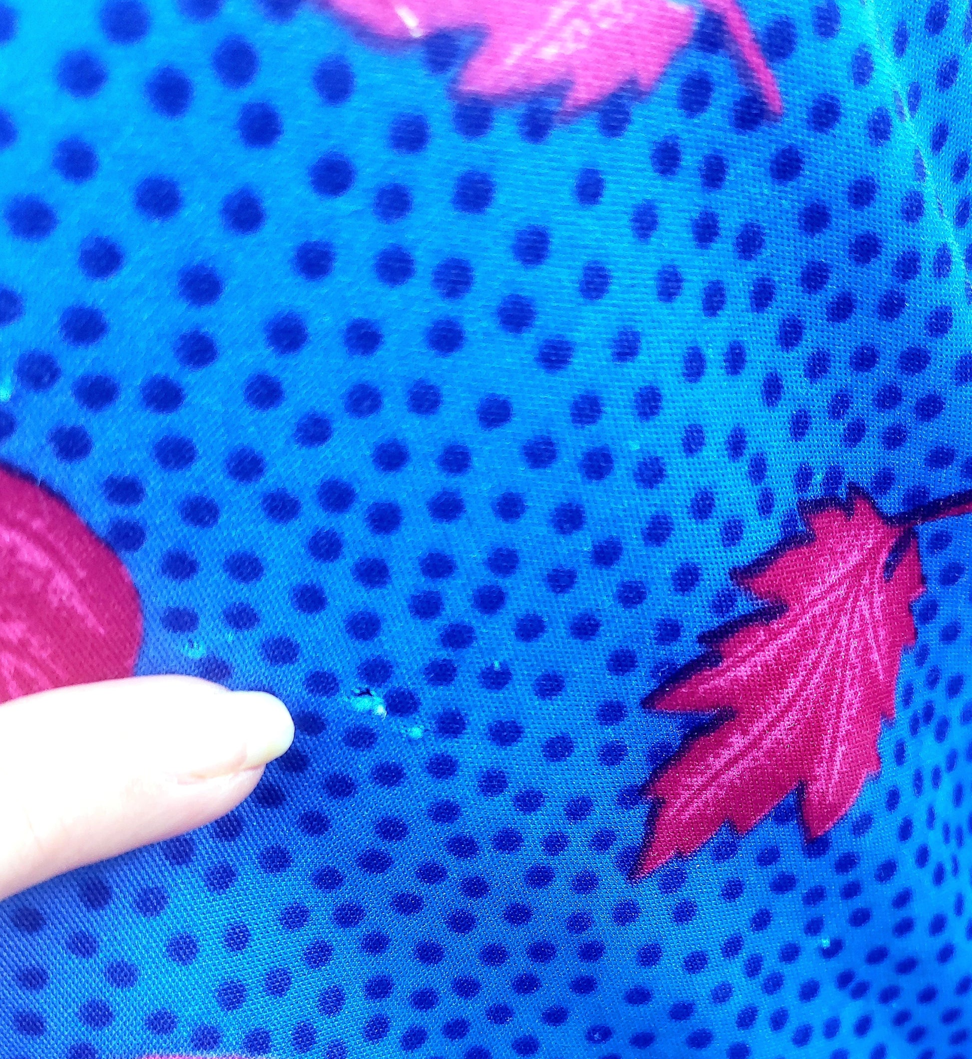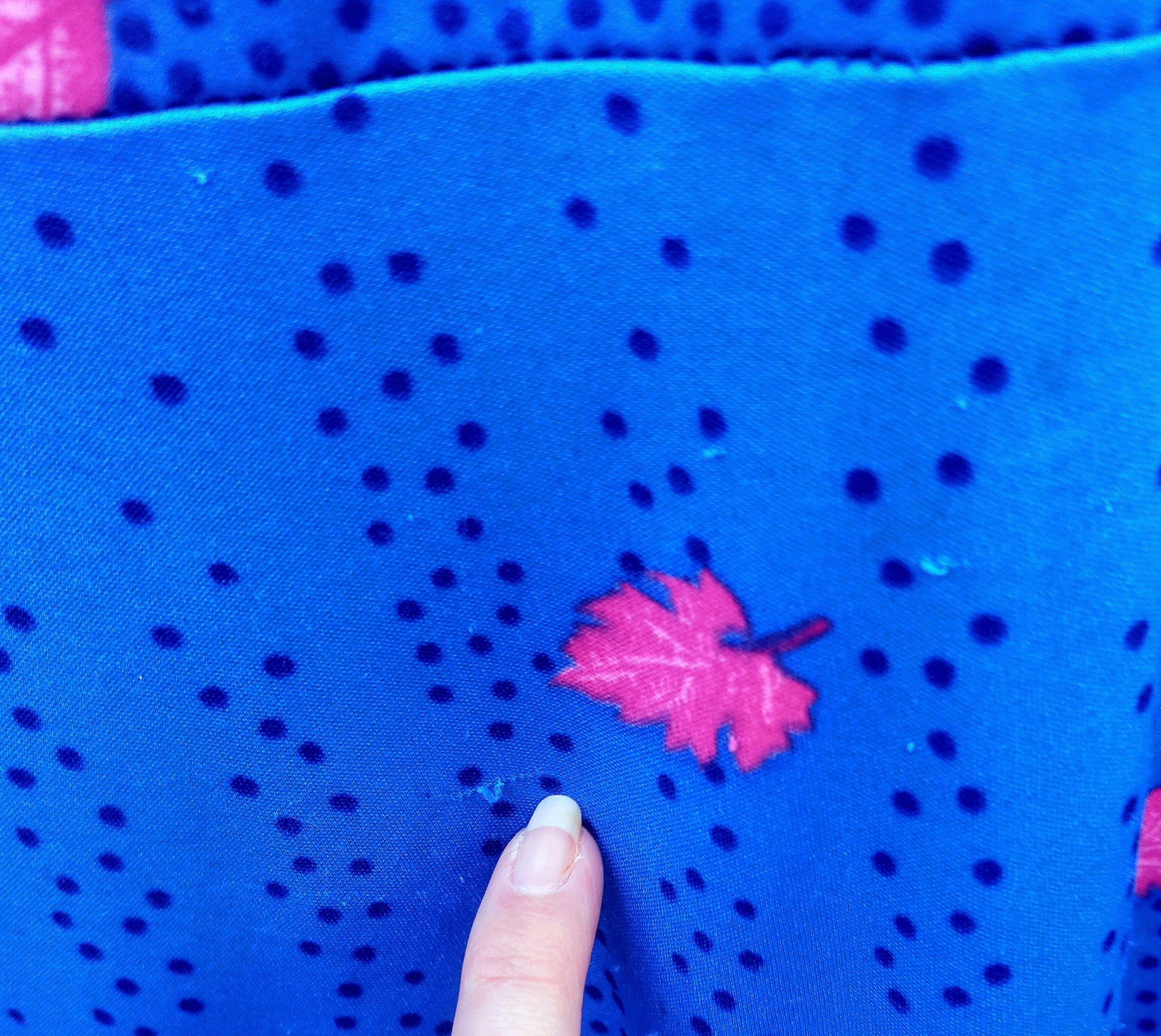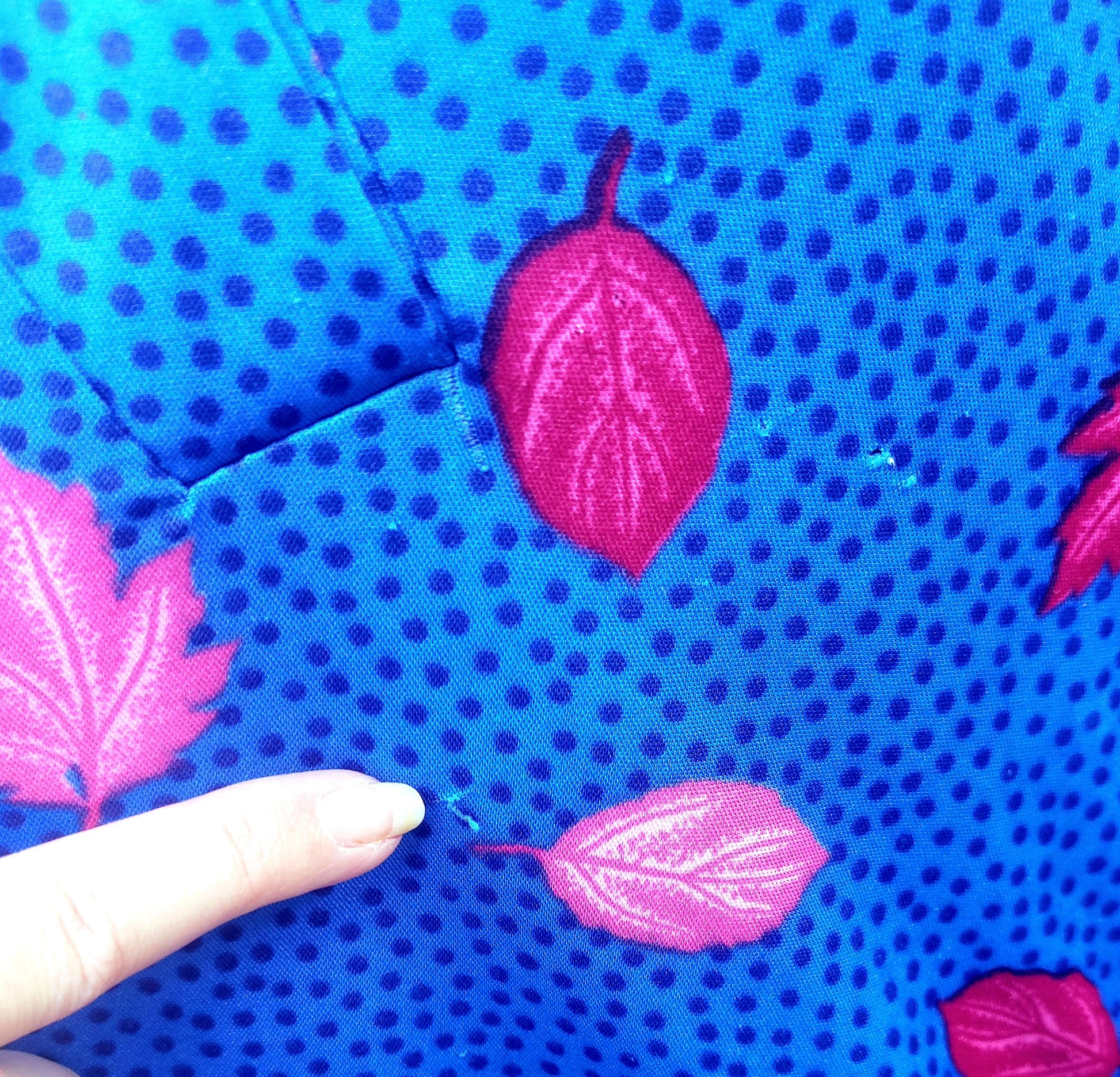 Bold and bright royal blue tea dress with pink leaves. Collared and blue buttons to the front. Capped sleeves with gathered rope ties on shoulders.