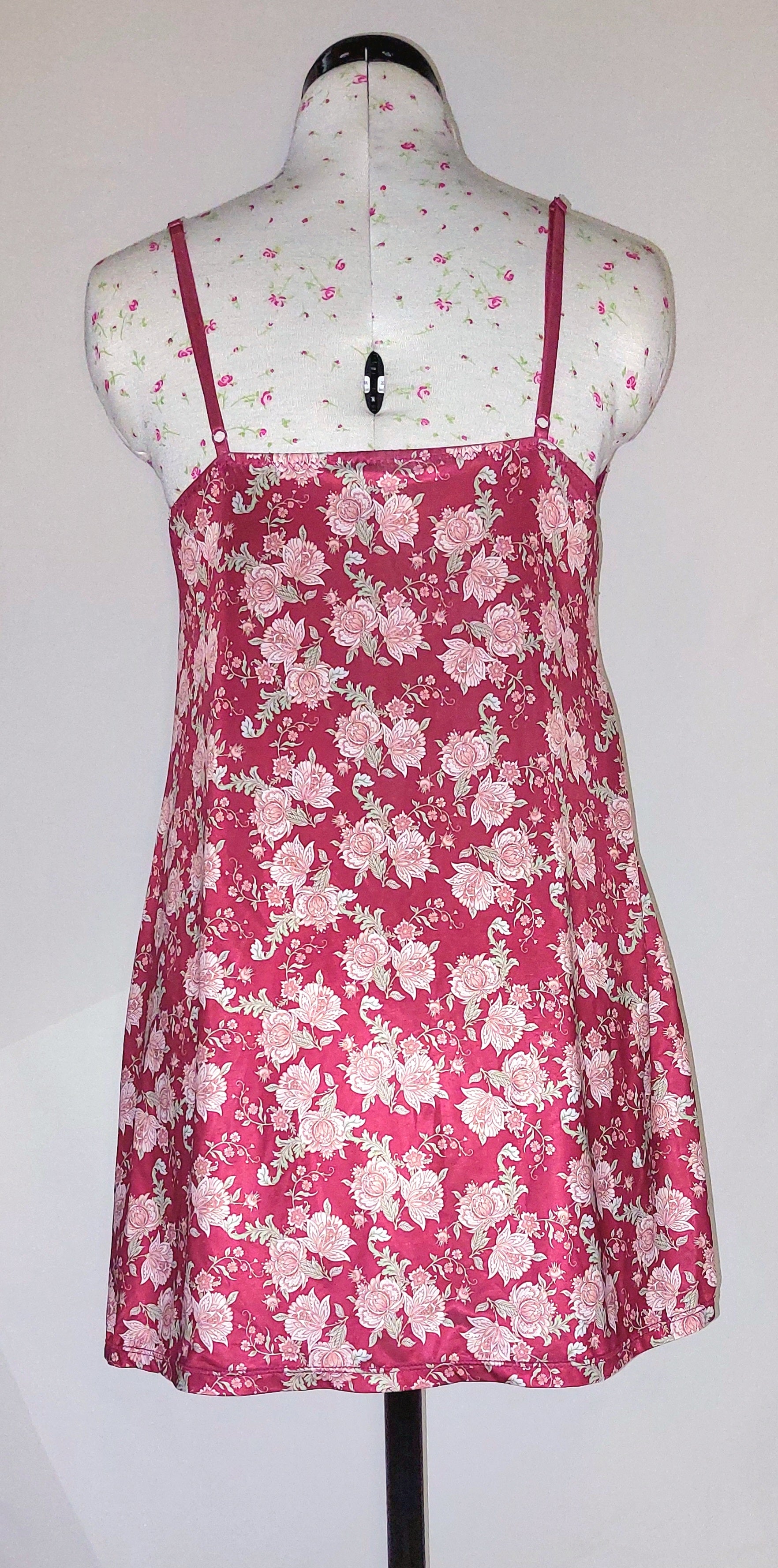 R&B Pretty Camisole dress, burgundy floral with lace bodice. Lined bust. Adjustable straps.