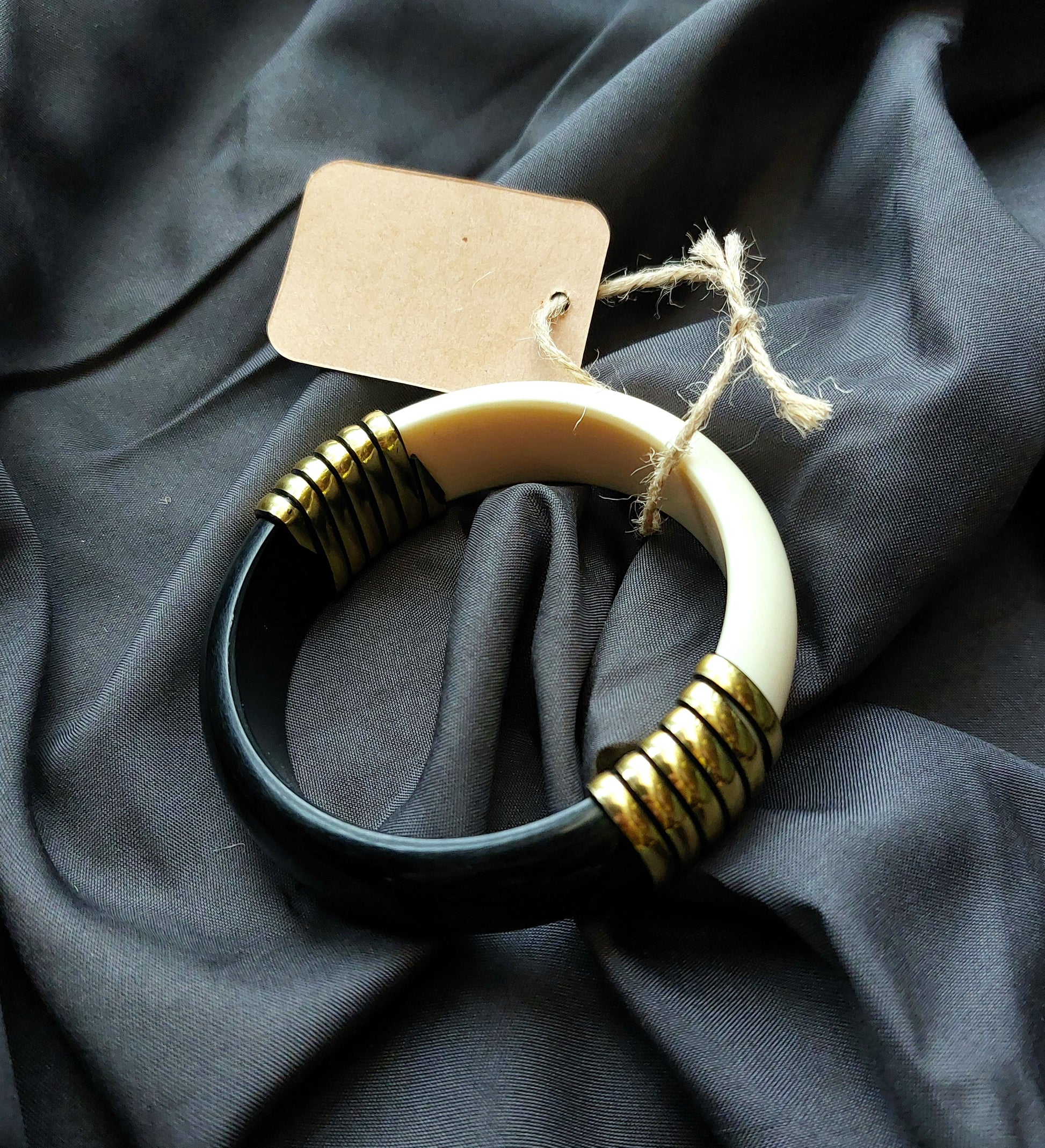 CREAM AND BLACK BANGLE WITH GOLD RIBBED DETAIL