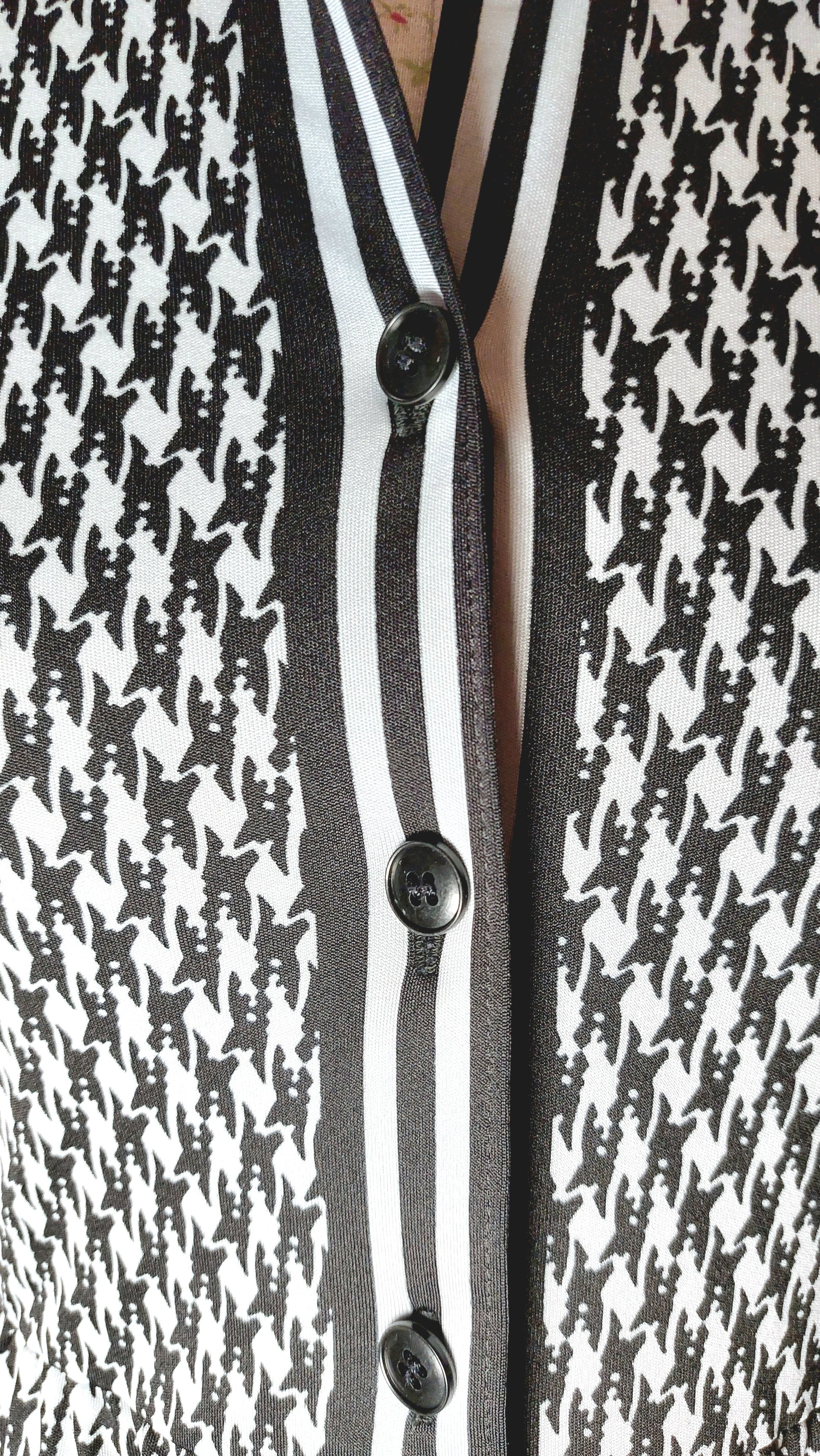Black and white dog tooth pattern with stripe detail down the button line and hem. Button through to the front and hook and eye to front of waist. Collared neck, long sleeved with button fastening on the cuffs.