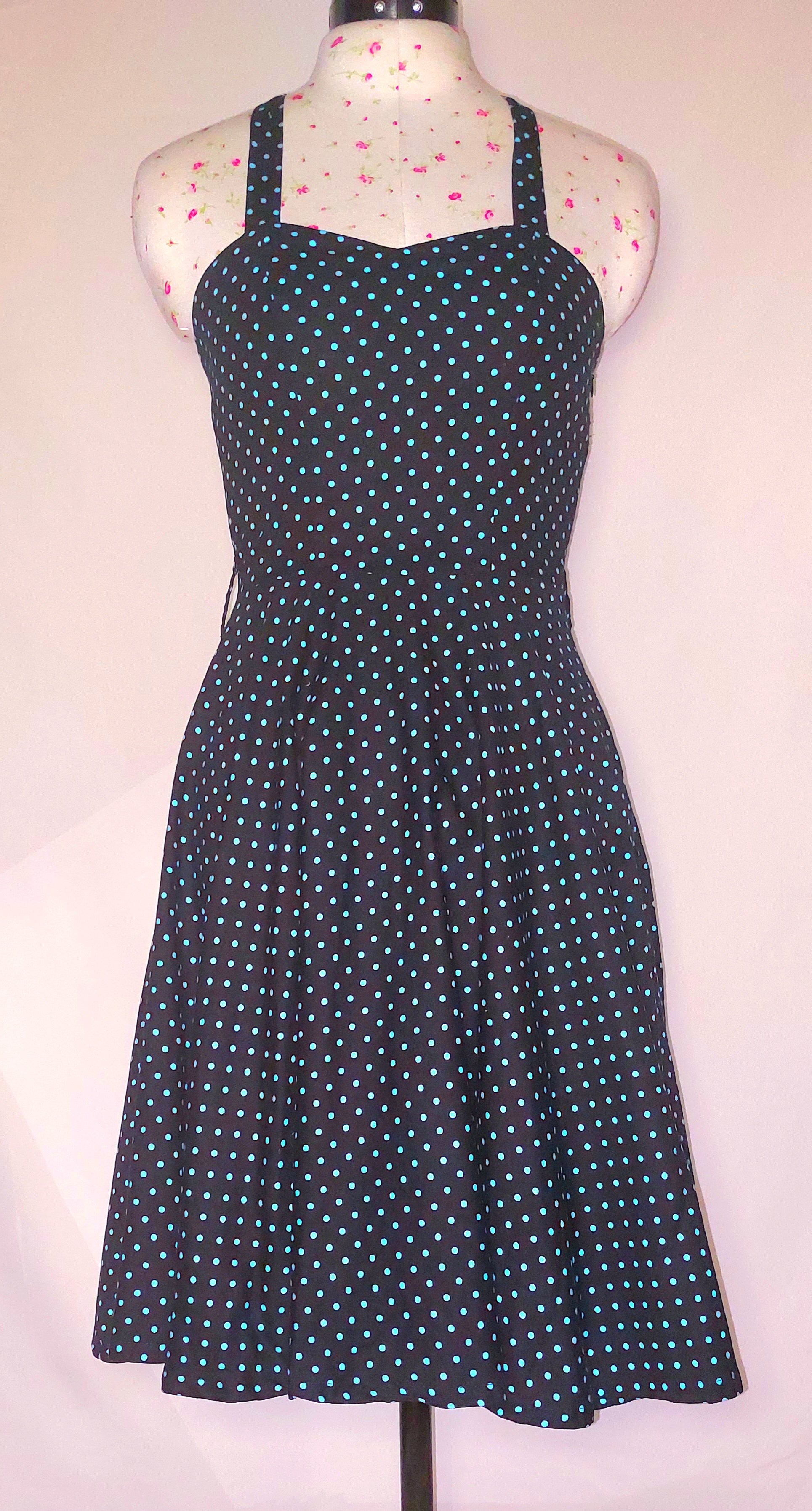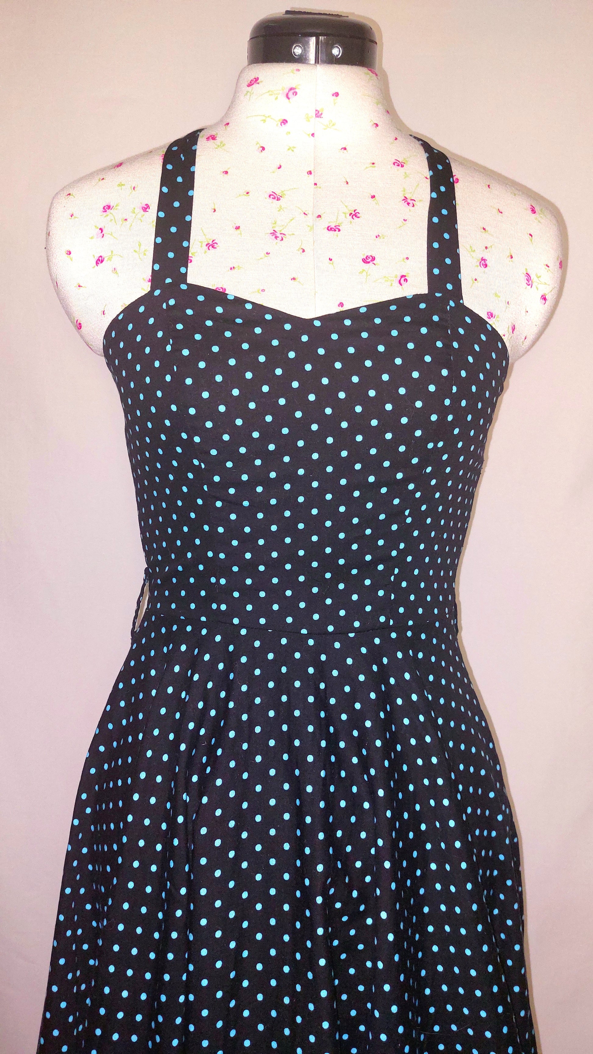 Cute black halter neck dress with bright blue spots! Small elasticated back piece.