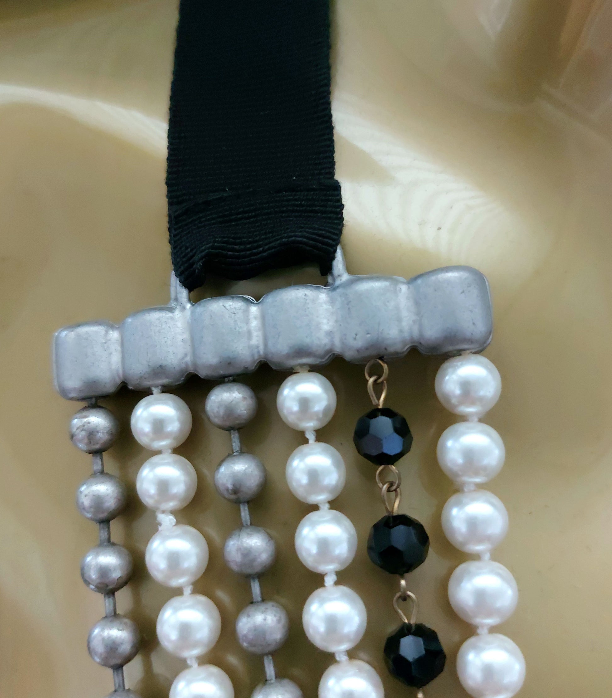 7 Rows of pearls (faux) and beads in cream, silver and black. Drop is 6".