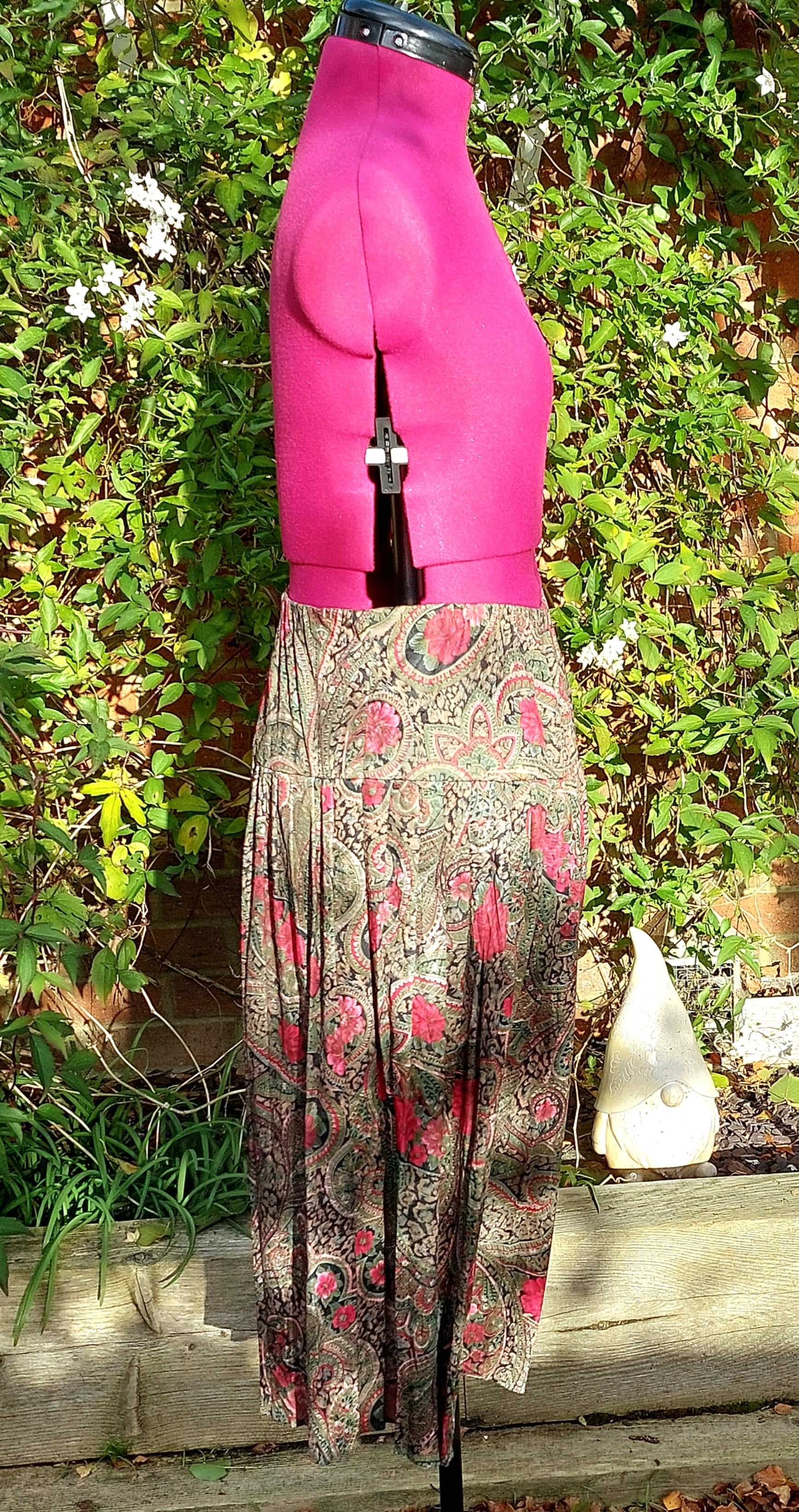 Mid length in greens and golds with pink flowers.