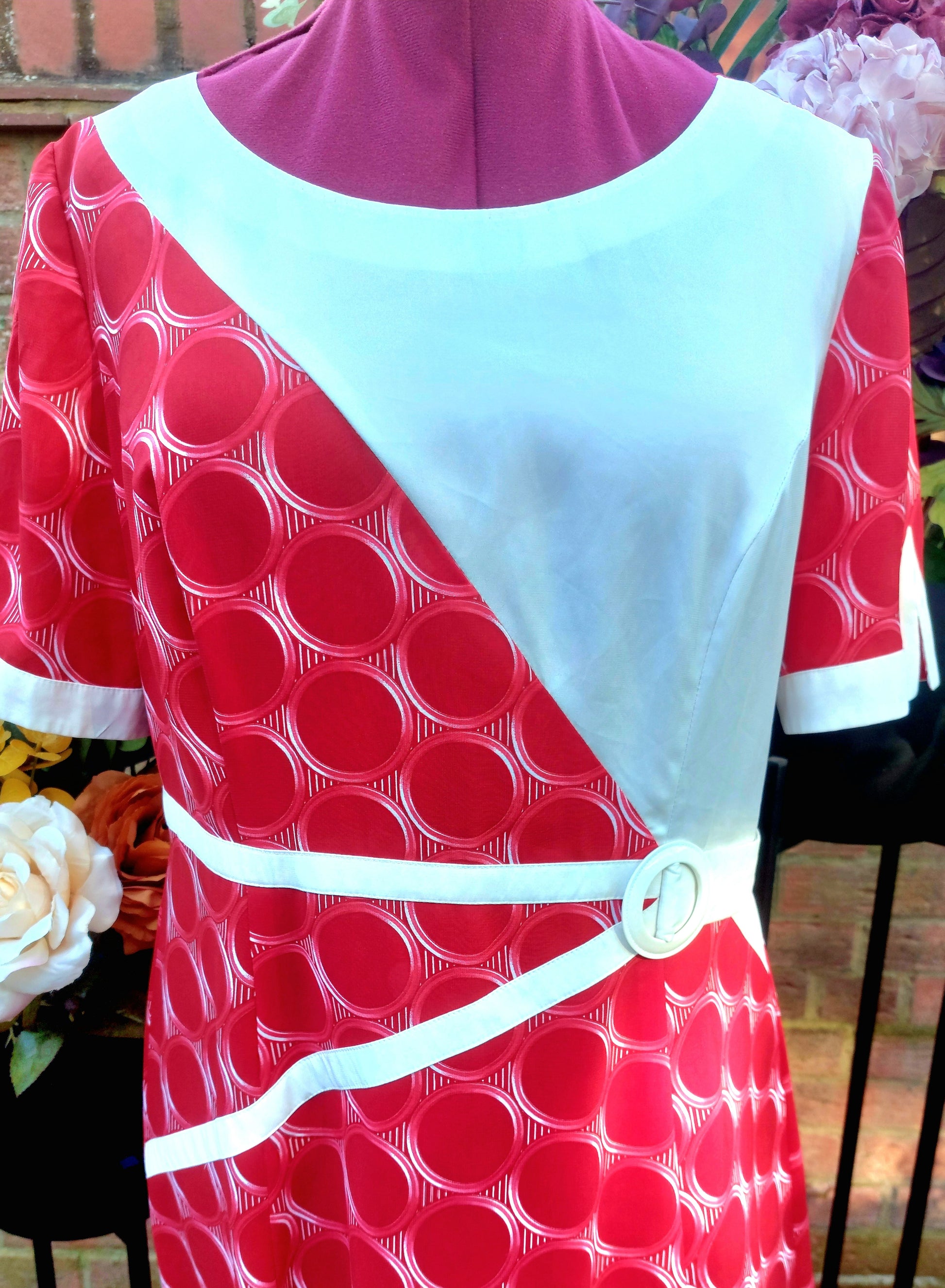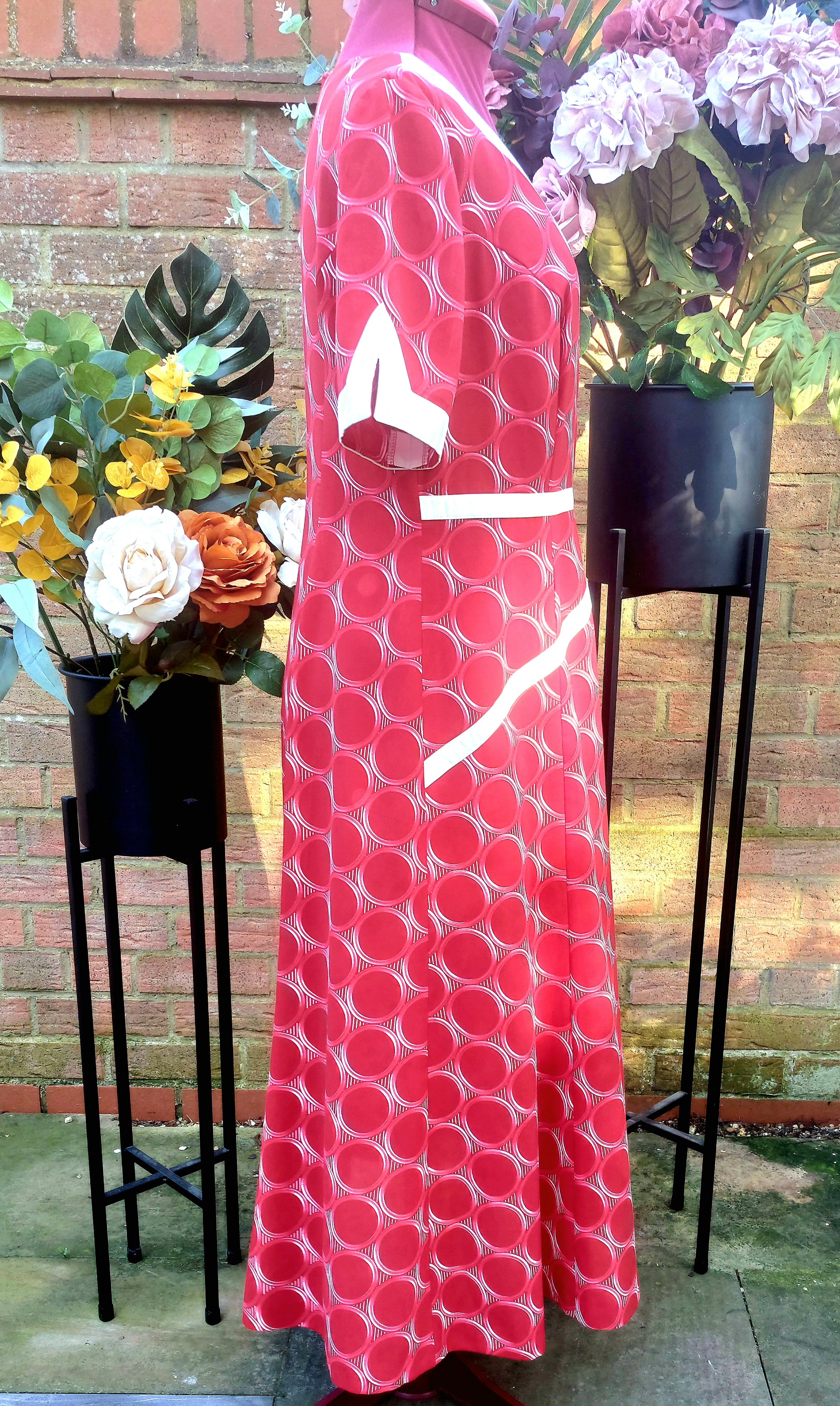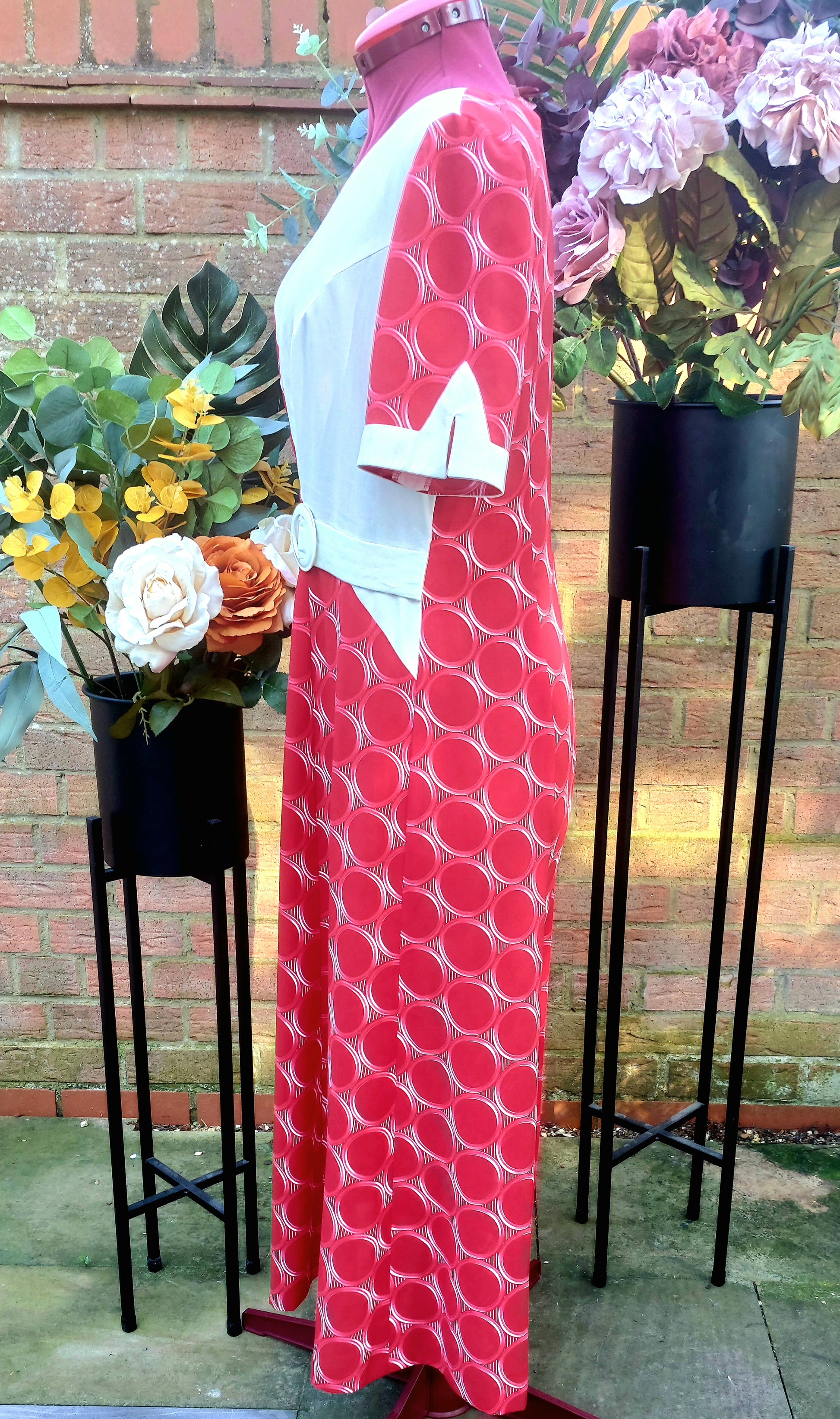 Red circle patterned short sleeved dress. Faux belt design, full length, white panel detail to side of torso. Lovely sheer floaty material.