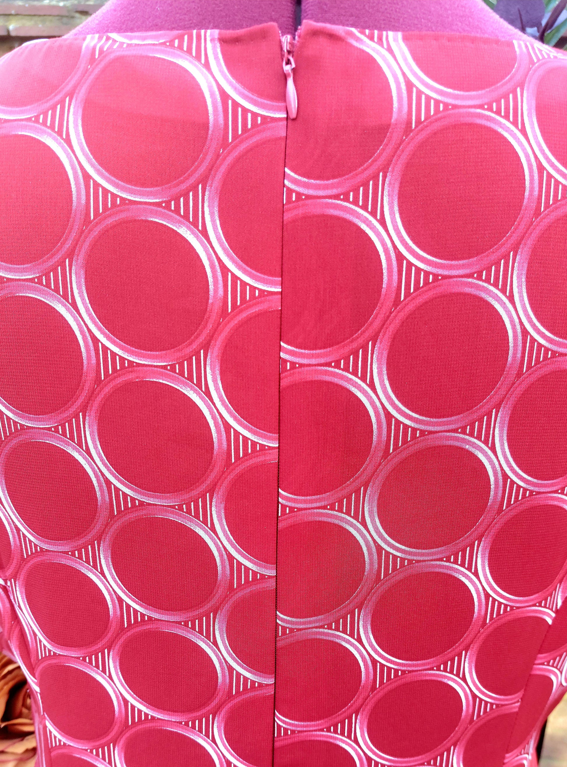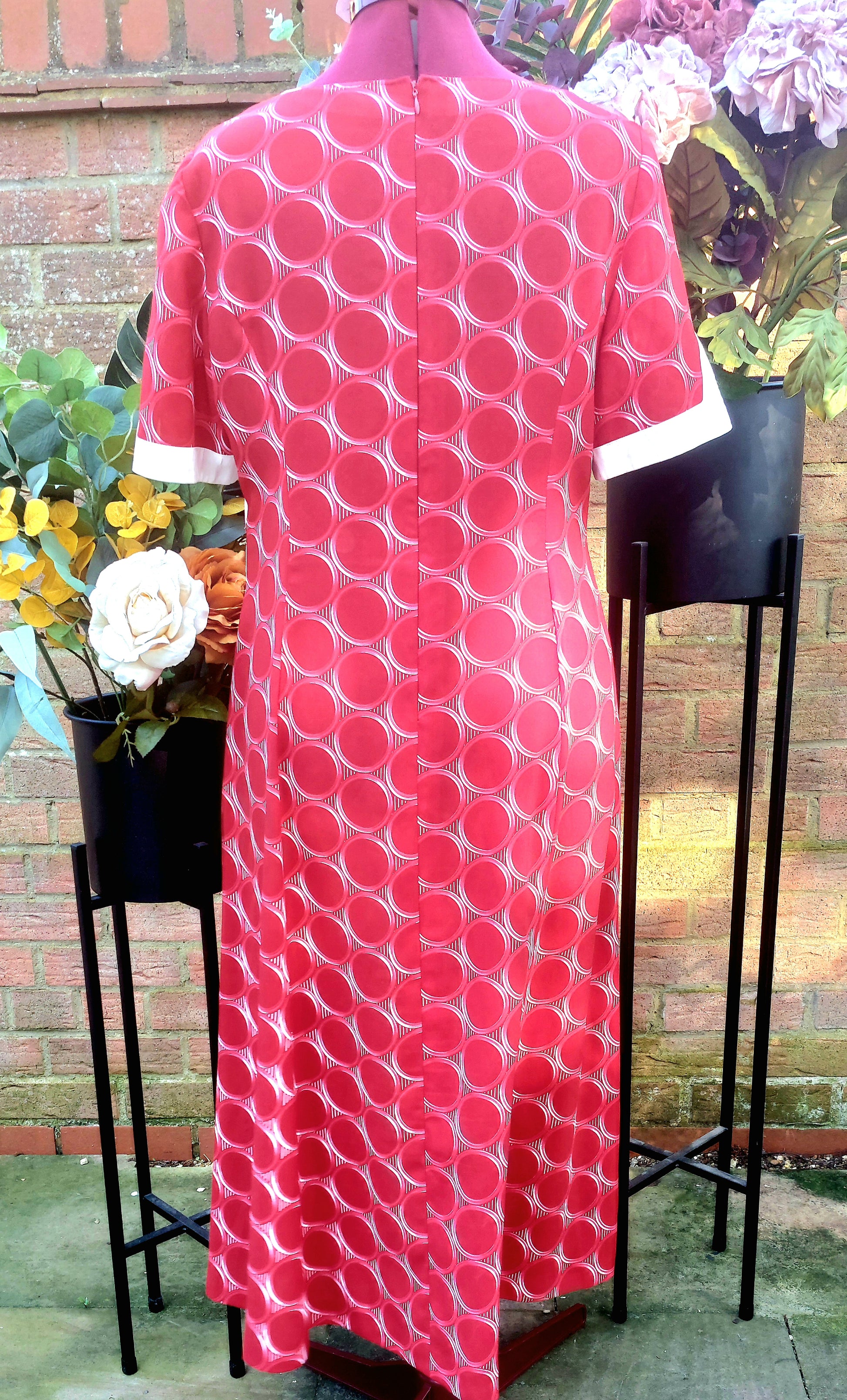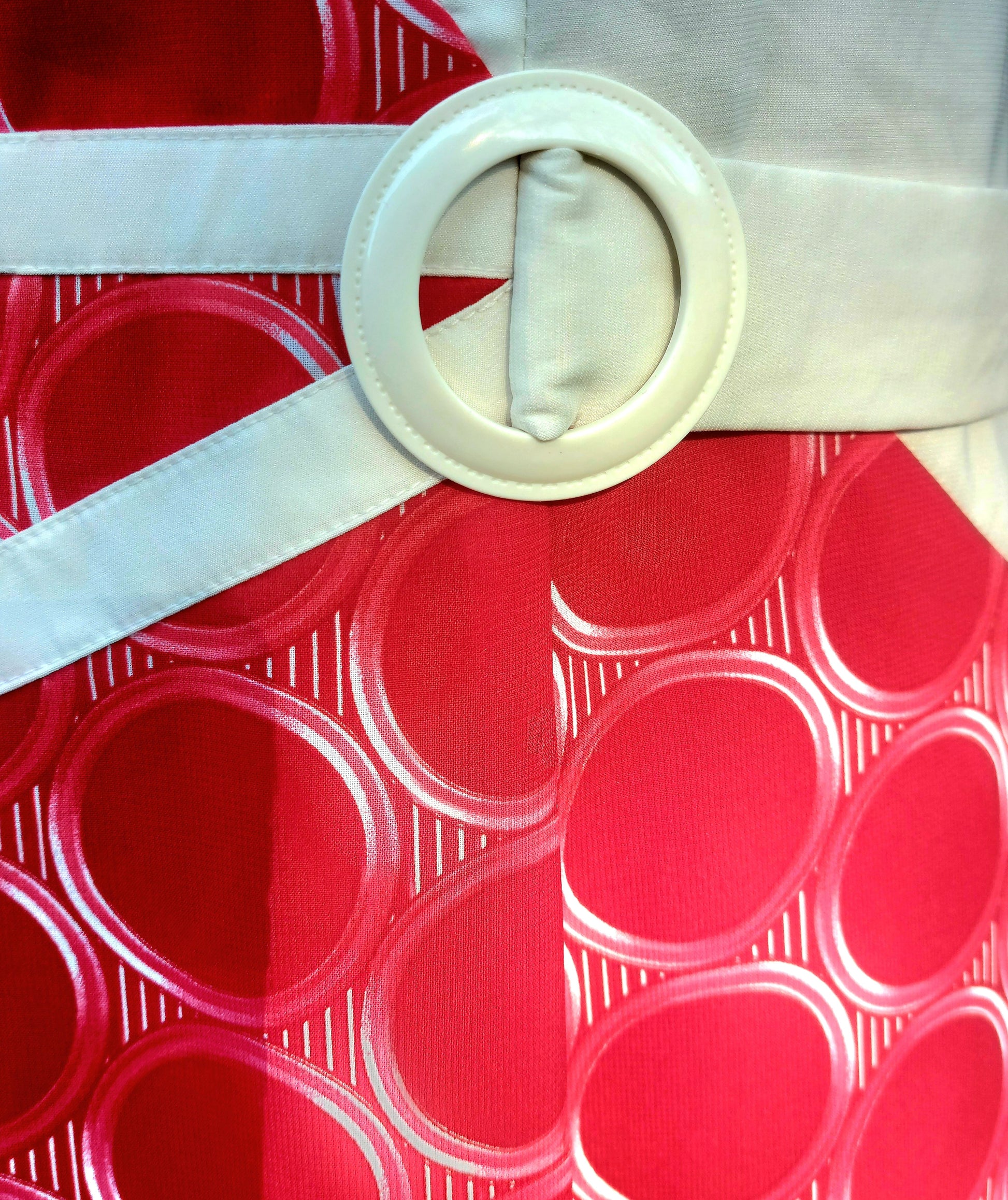 Red circle patterned short sleeved dress. Faux belt design, full length, white panel detail to side of torso. Lovely sheer floaty material.