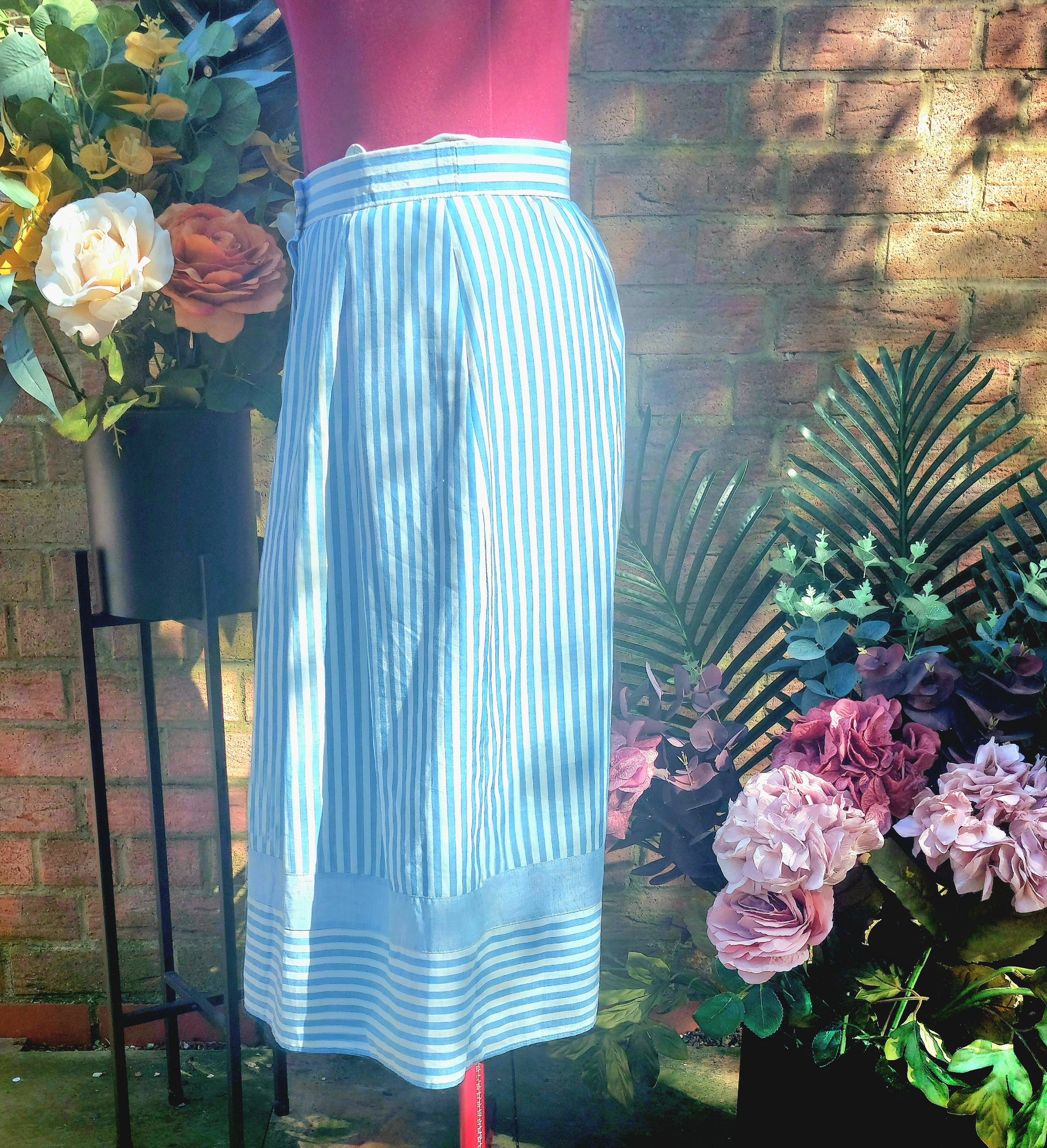 Cute blue and white lined flared skirt. White button through down the front. Marl blue horizontal stripe near the bottom. Stiff waistband.