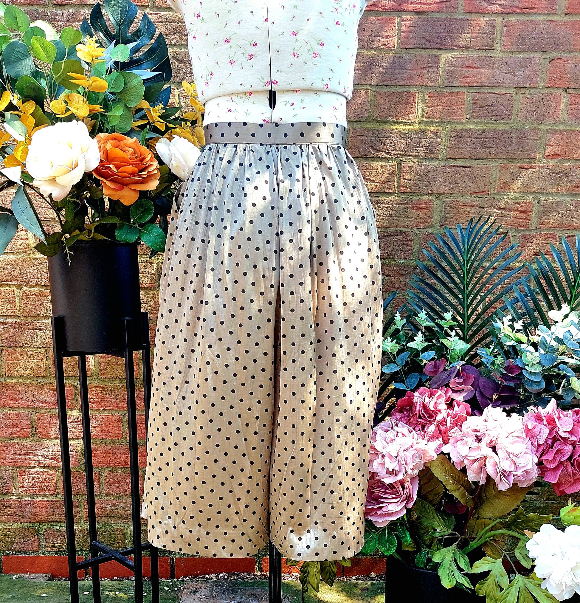 Stunning gold polka dot culottes. Very soft, and very flared. 3/4 length with side pockets.
