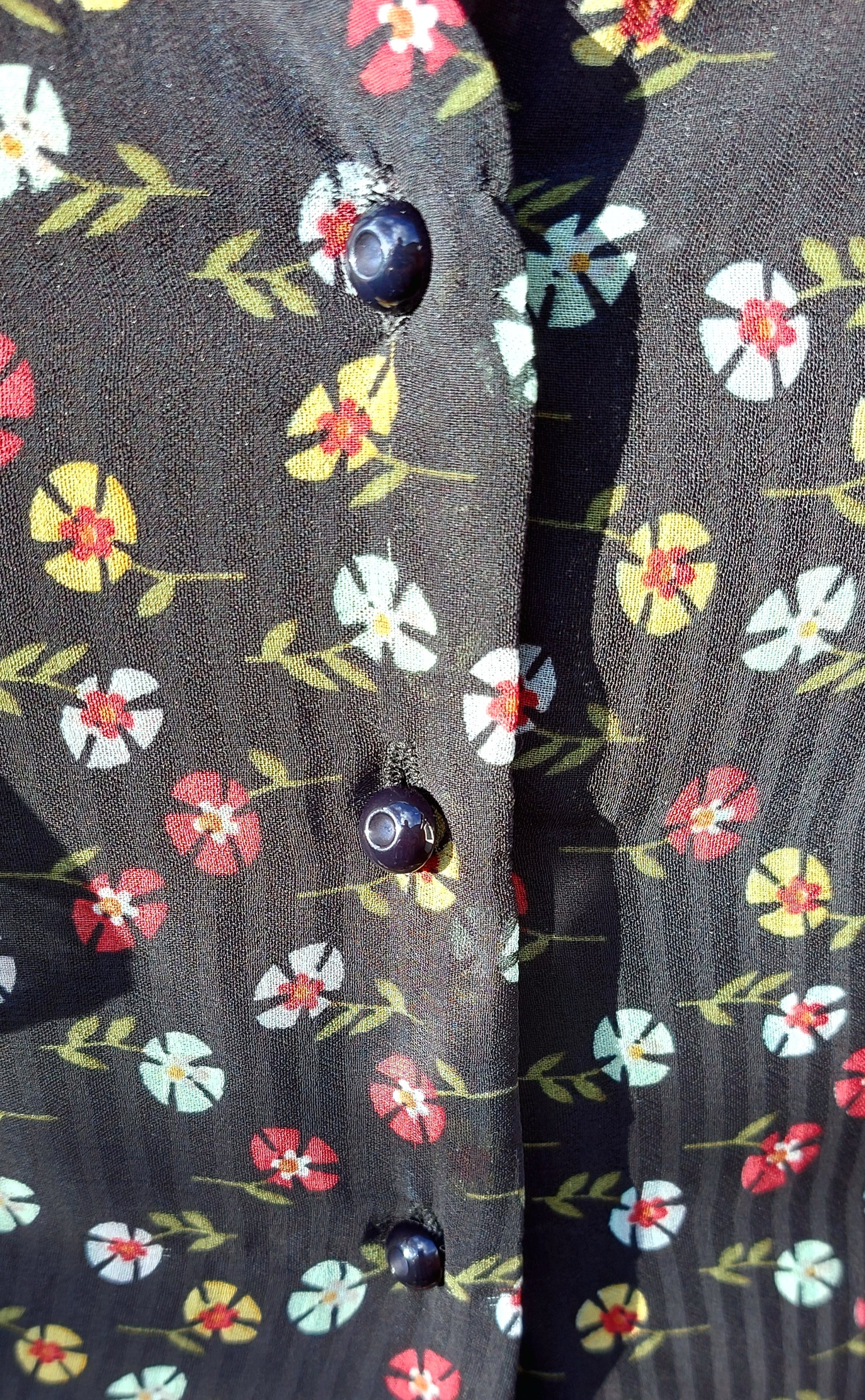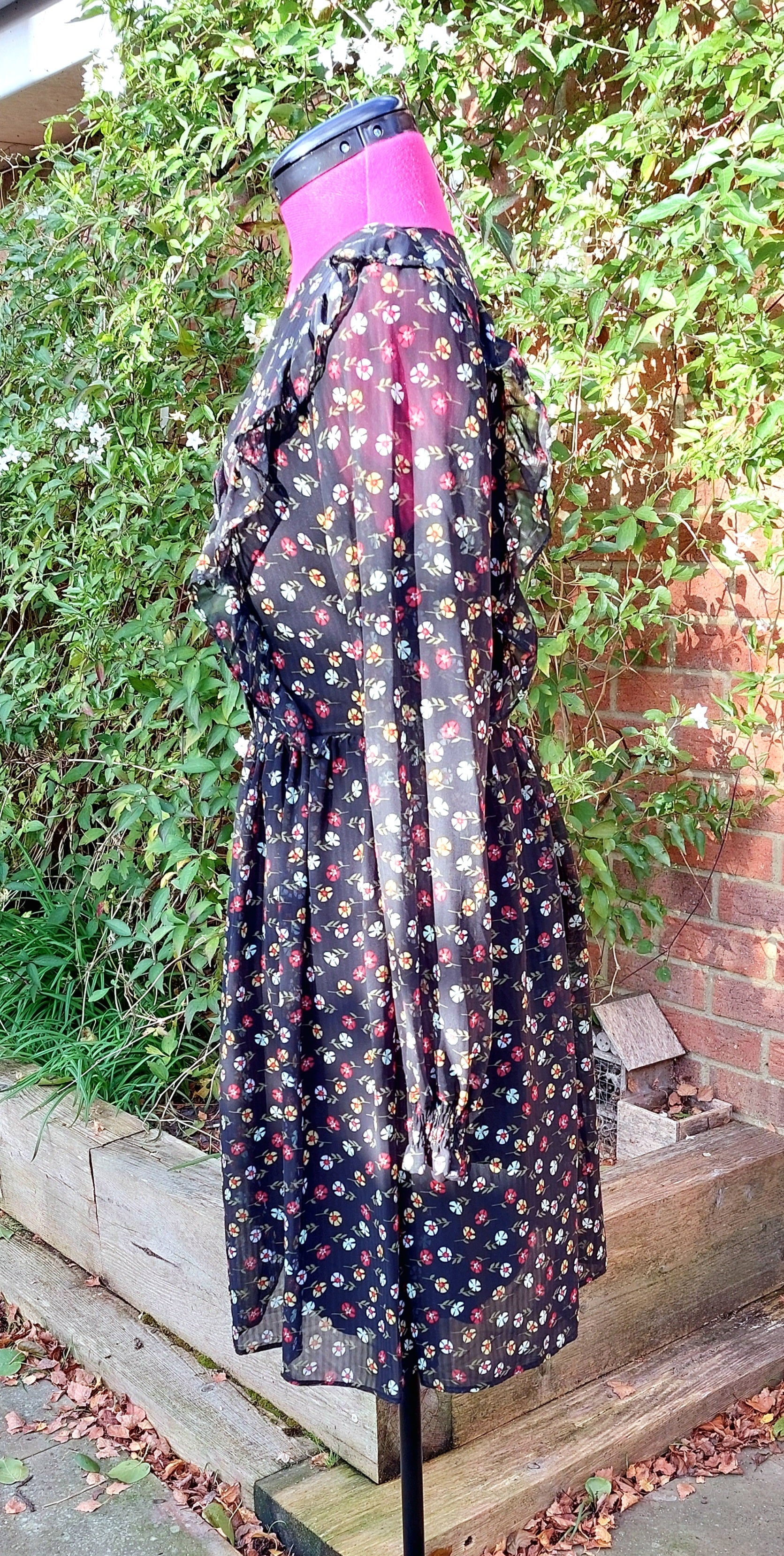 Cute black floral long sleeved dress. Fluted detail to front and back. Side zip.
