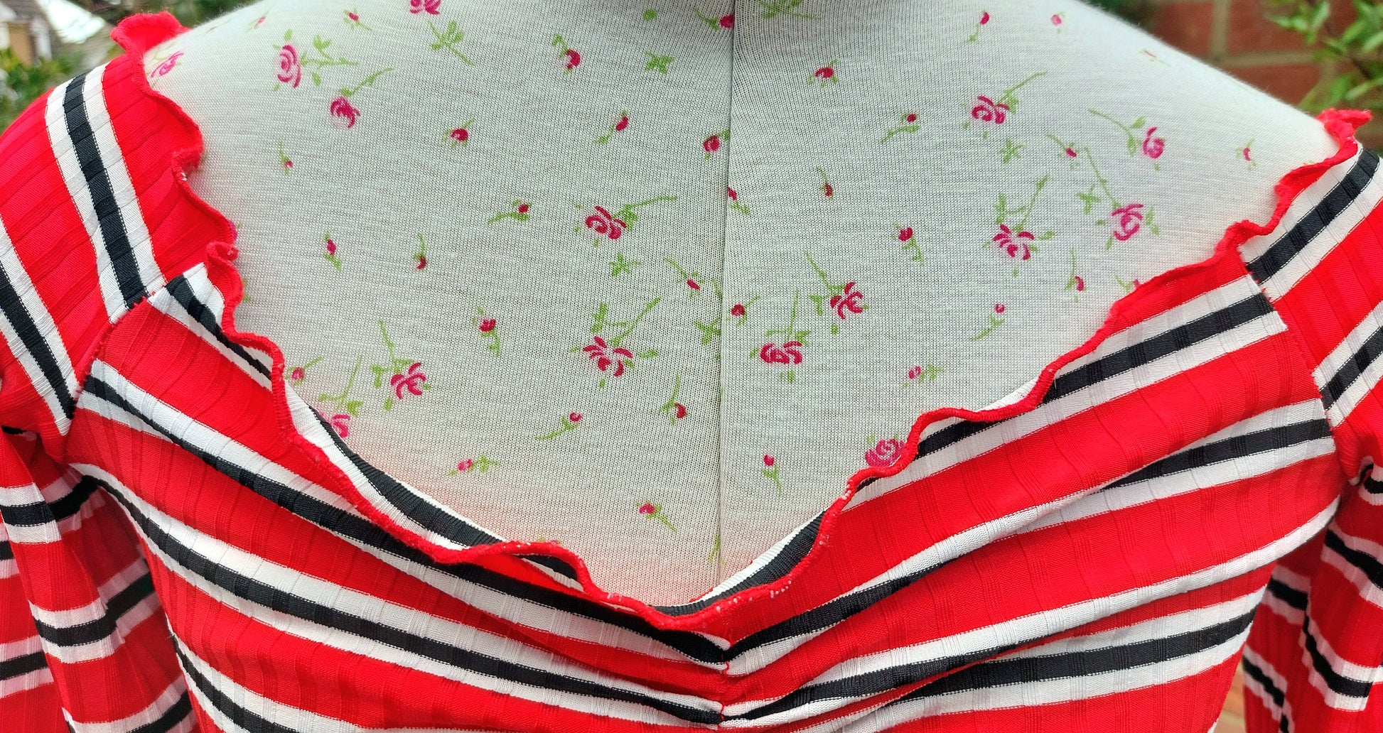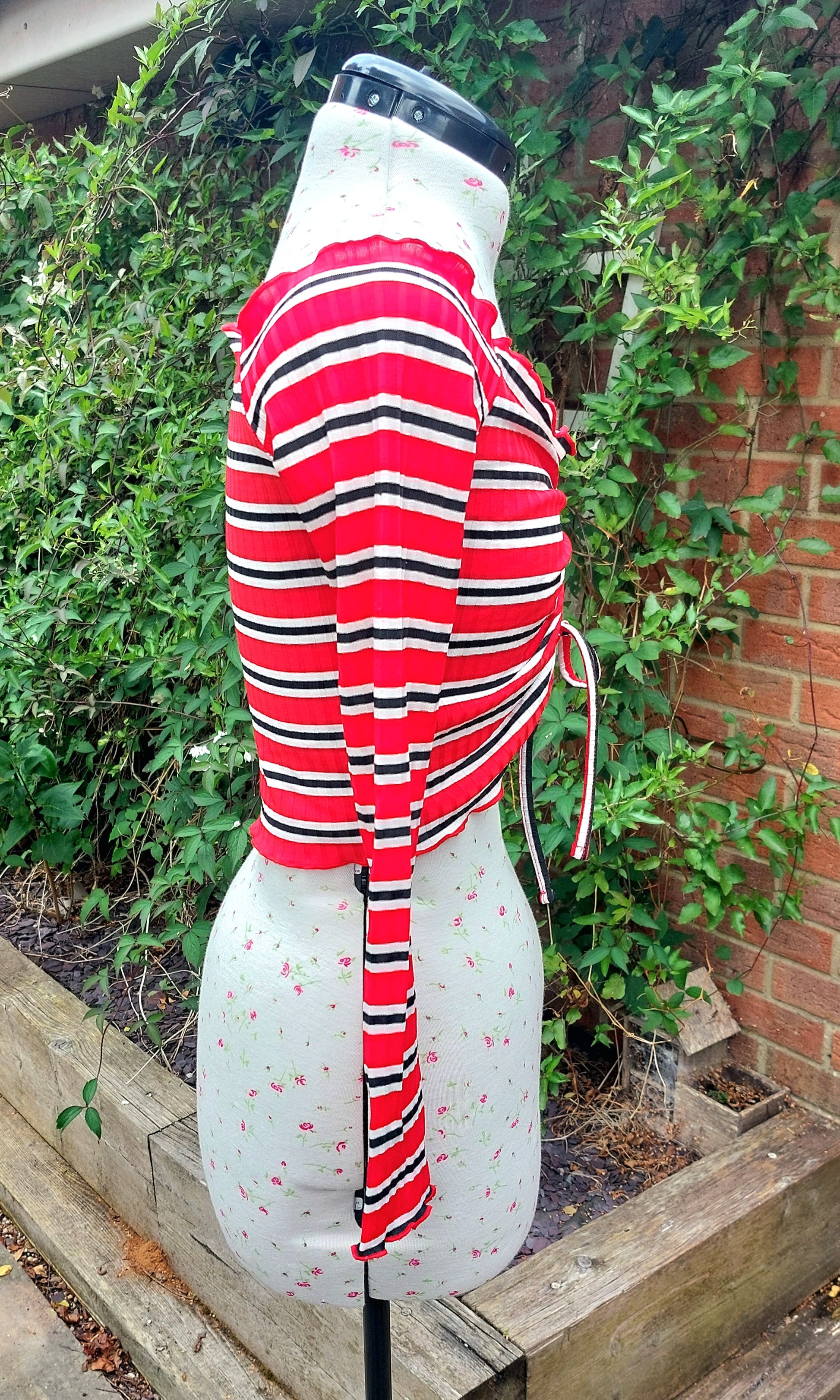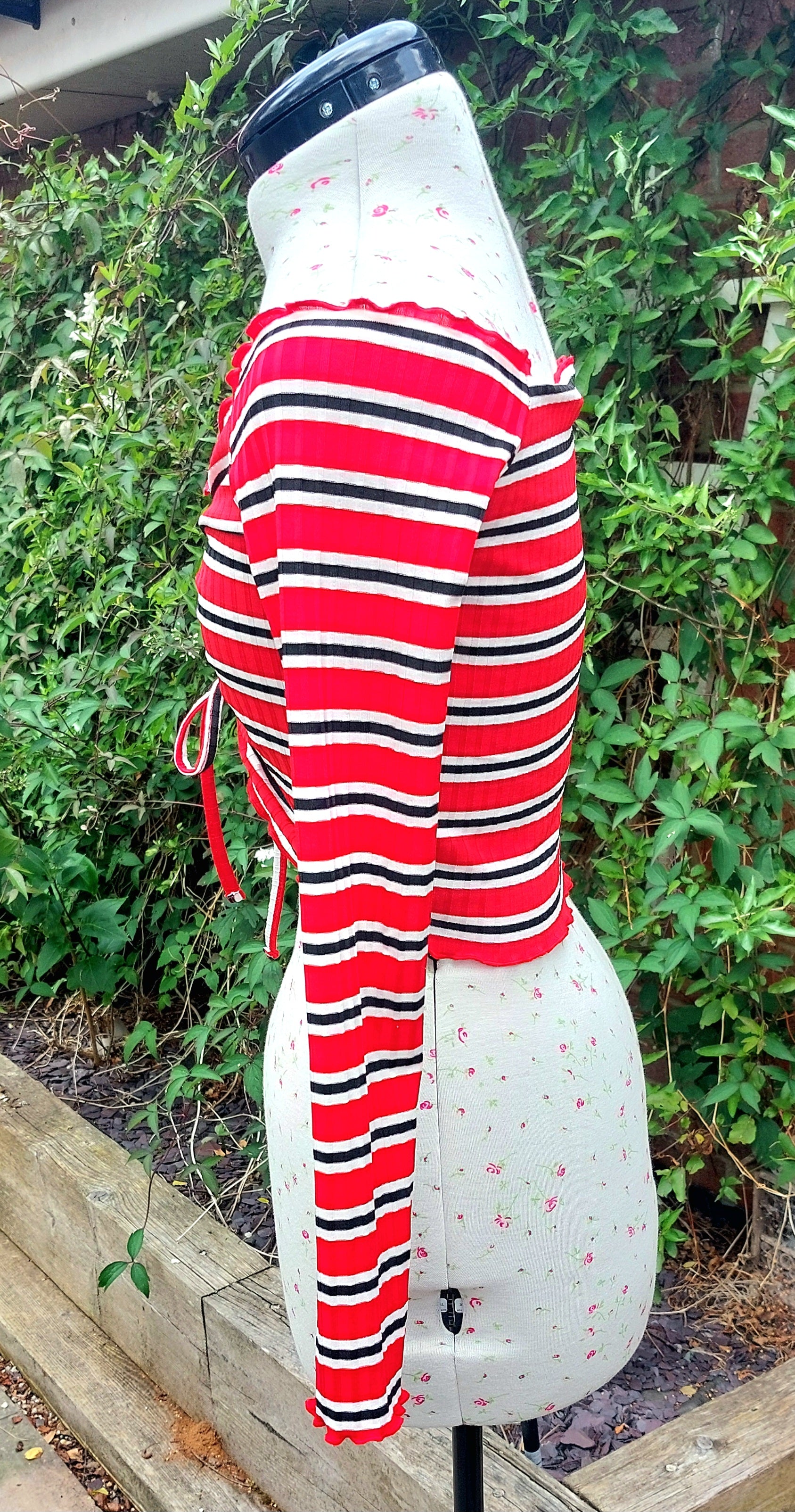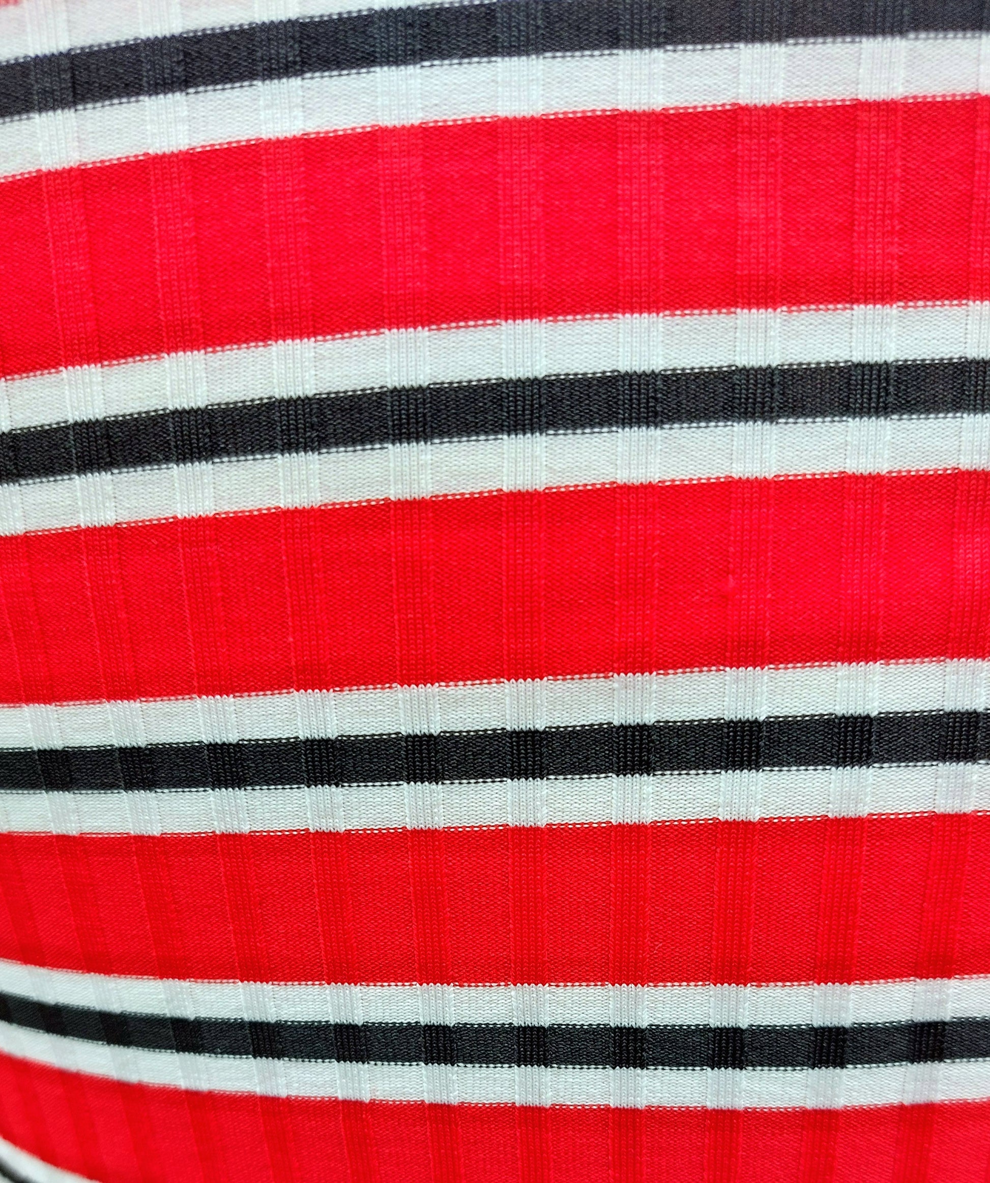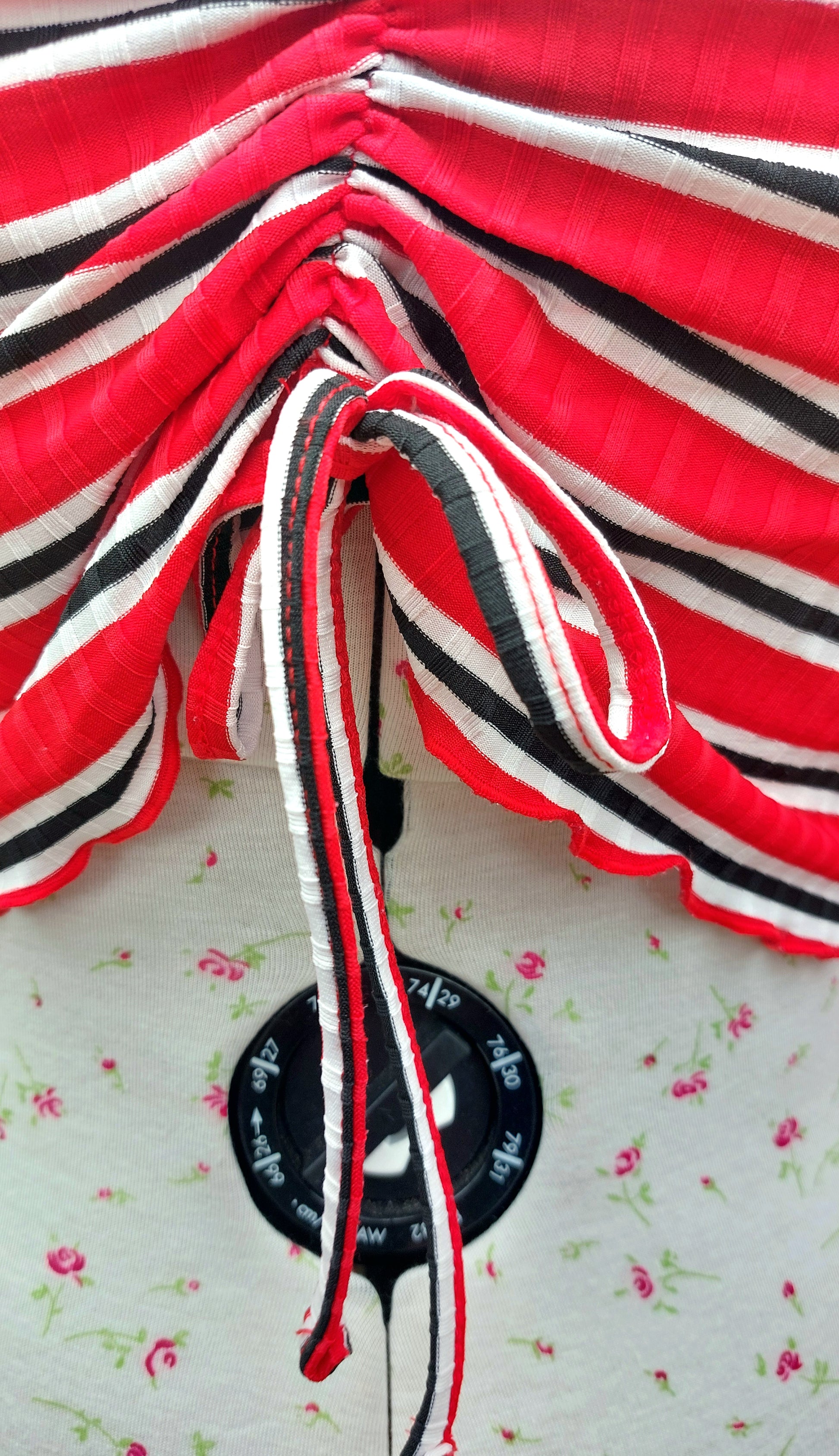 Cute ruched red, black, and white striped crop top.