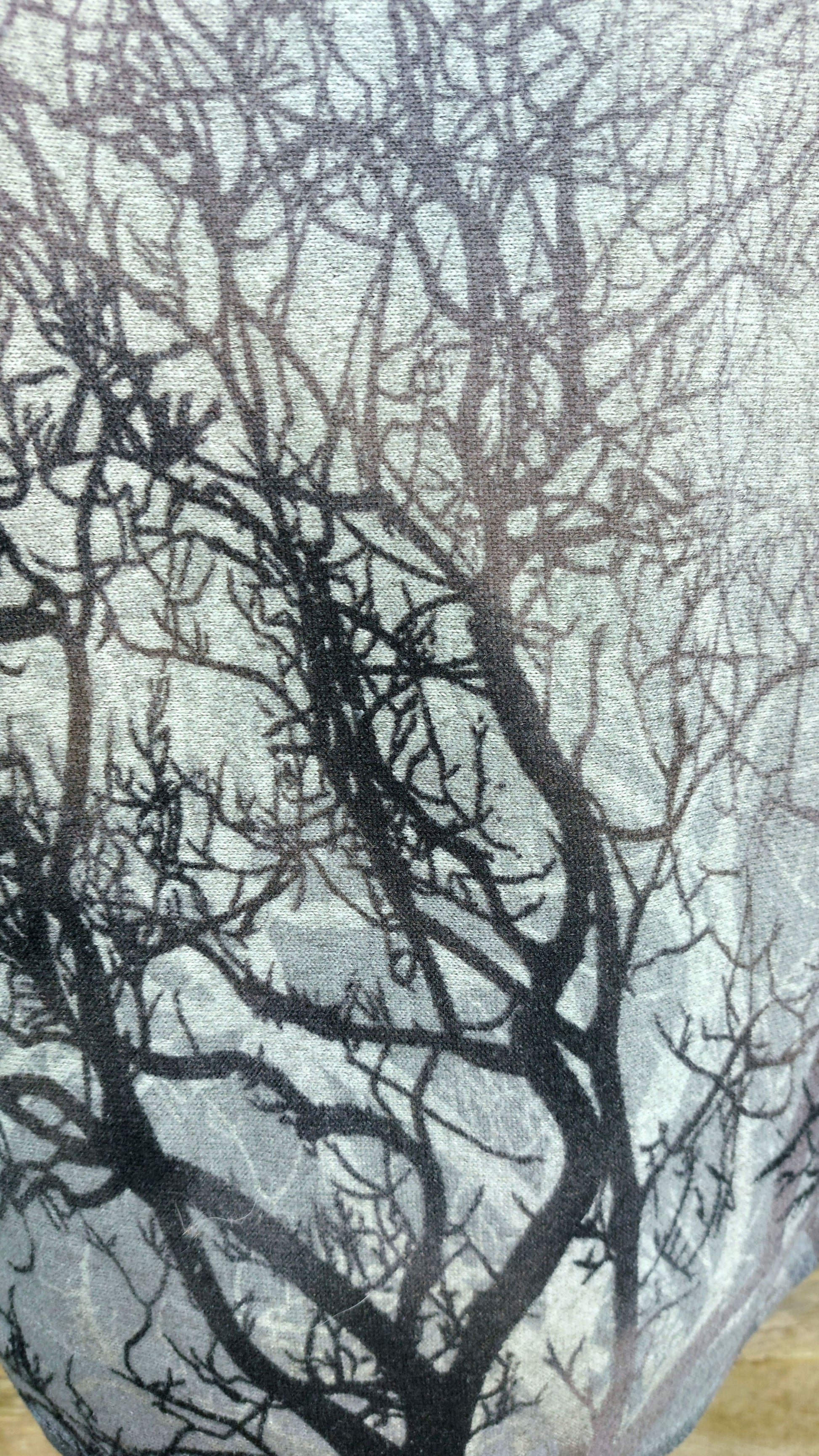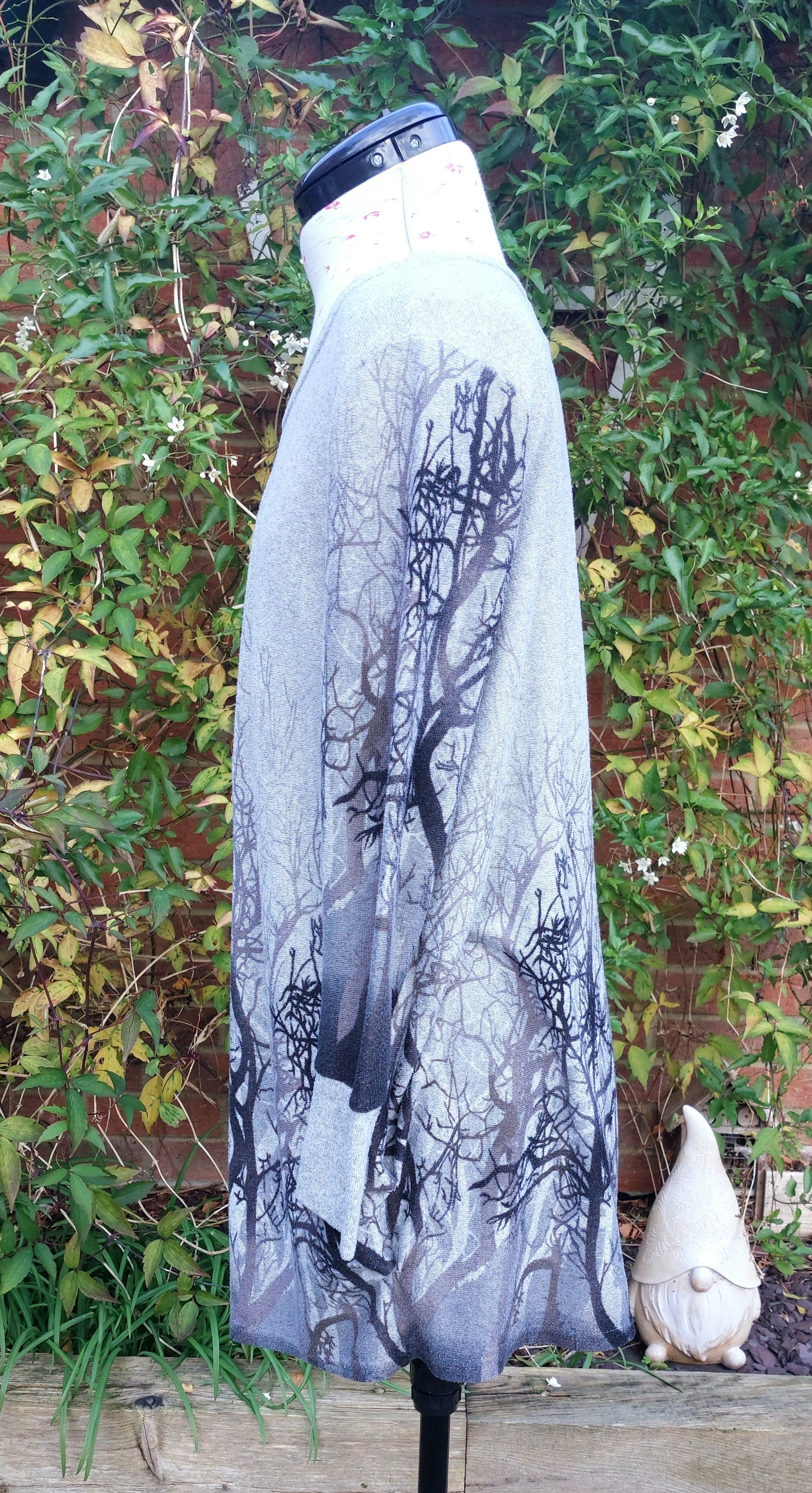 Unusual woodland print grey jumper. 3/4 length sleeves, long line jumper.