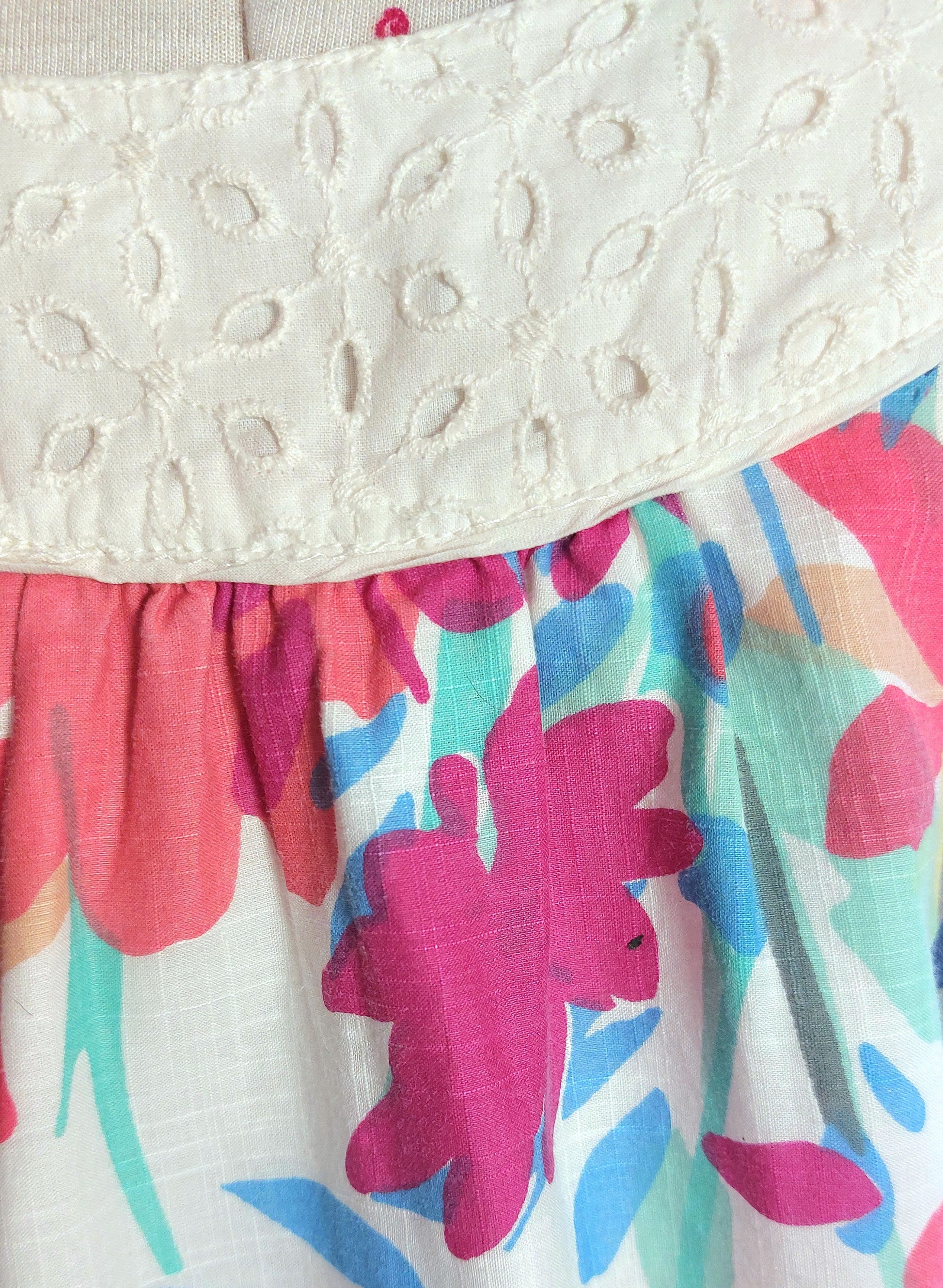 Sleeveless with a wide band of broderie anglaise around the neckline.