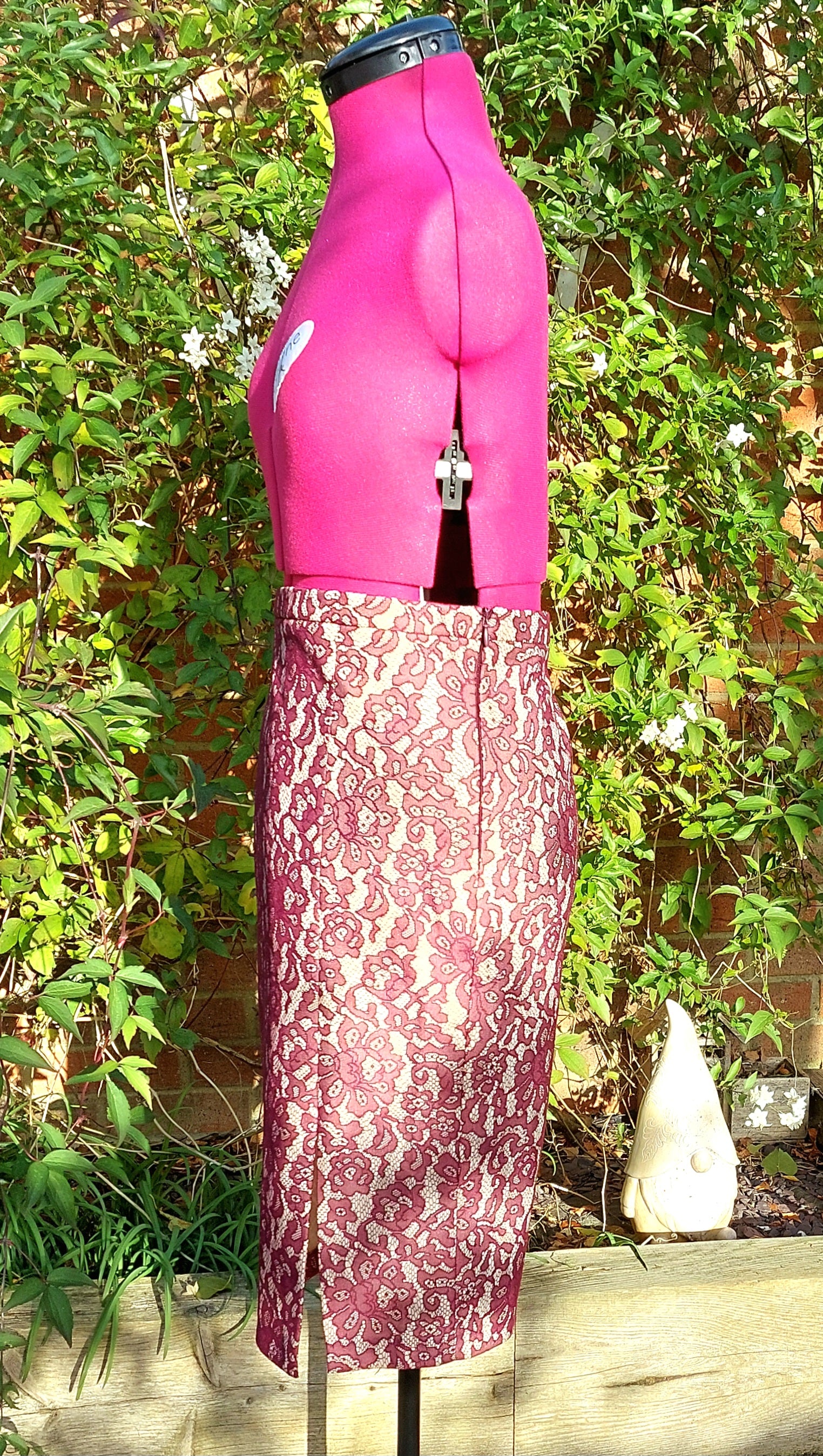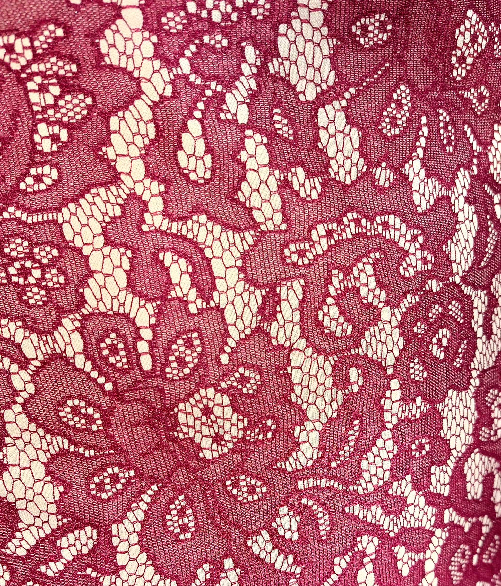 Pretty burgundy pencil skirt. Lace overlay, beige base material.