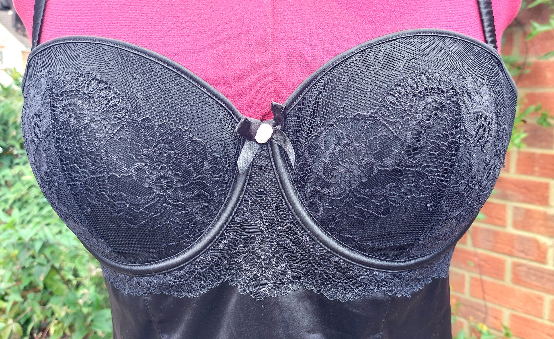 Bodice is an enclosed underwired bra. Also has attachments at the hem for suspender straps (straps not included).