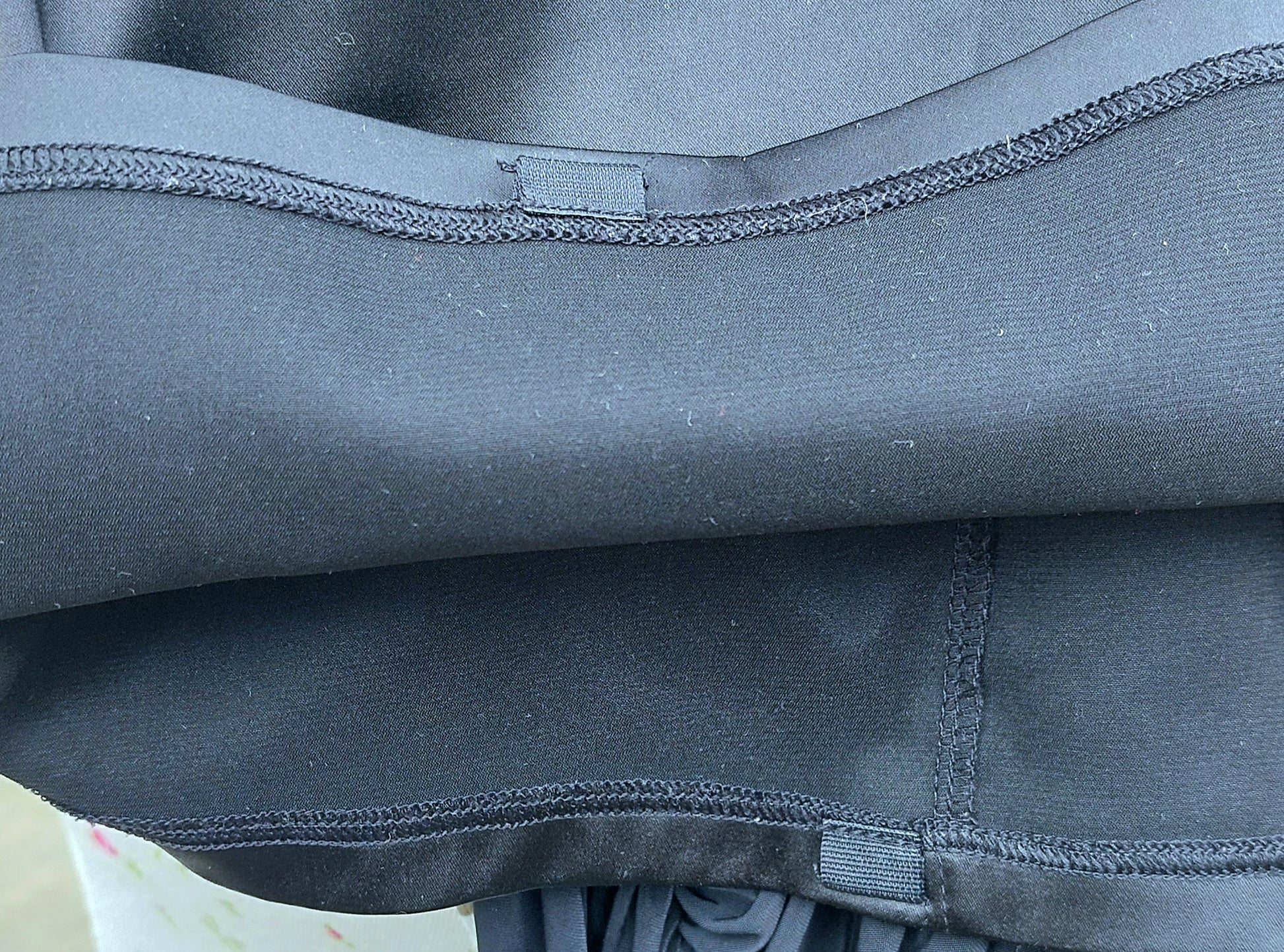 Black satin short dress with slight stretch. Adjustable shoulder straps with gold detail, and hook and eye to rear.