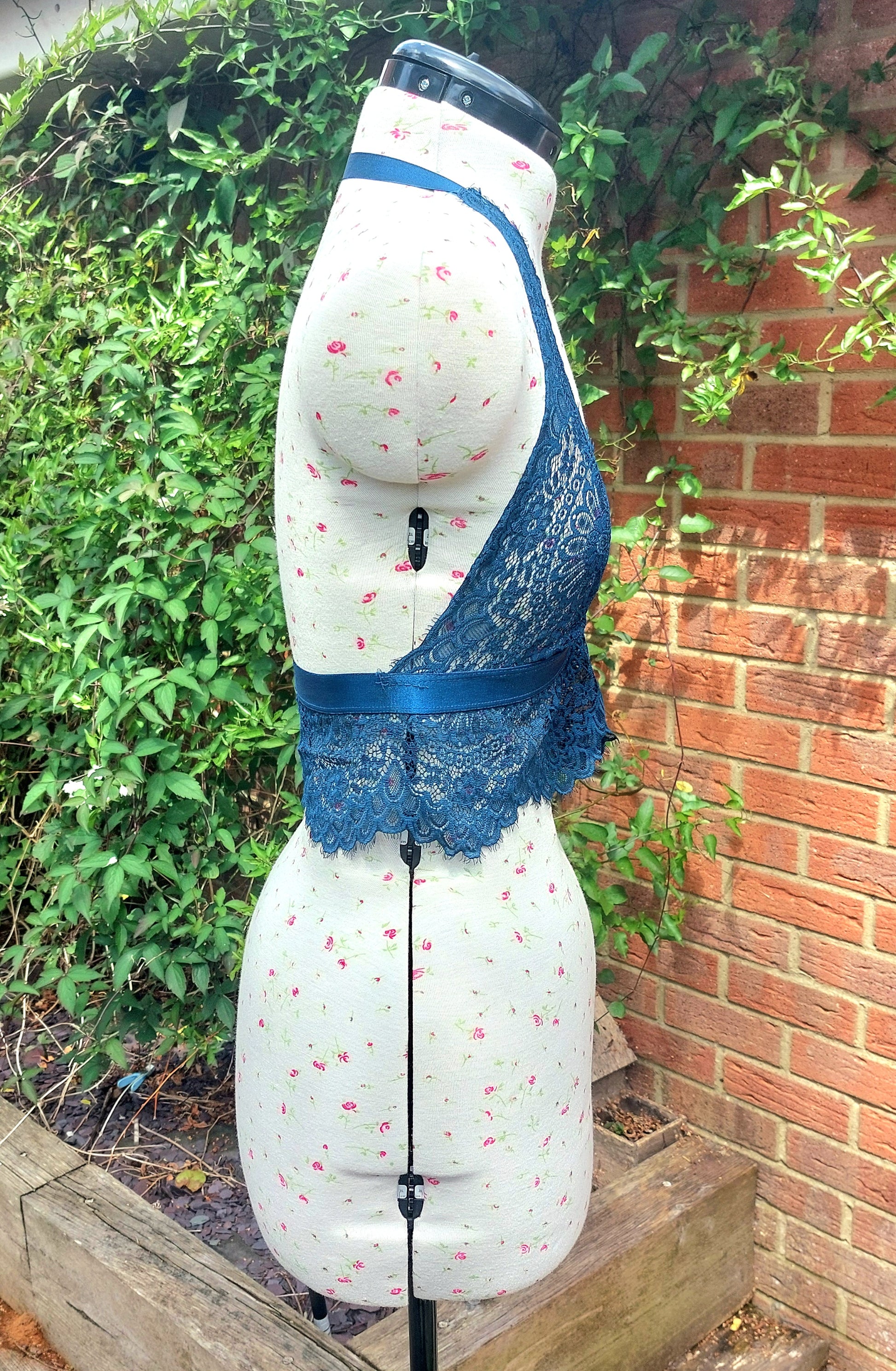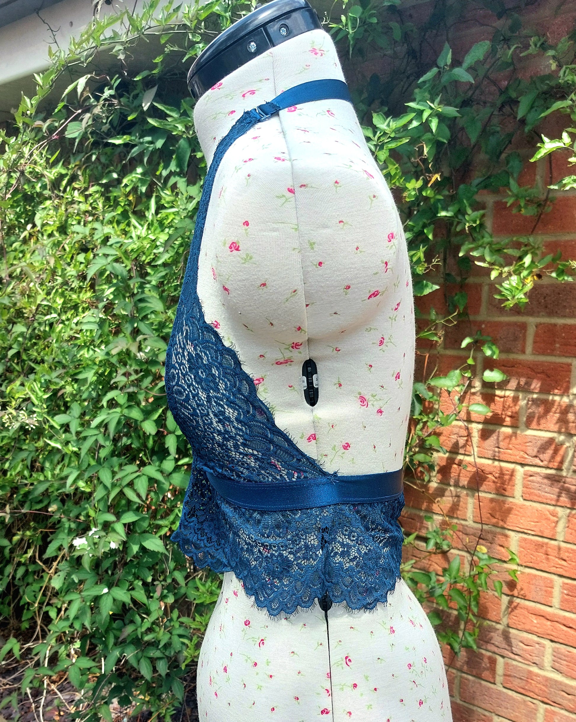 SIZE M PETROL BLUE HUNKEMOLLER LACE HALTER BRALETTE