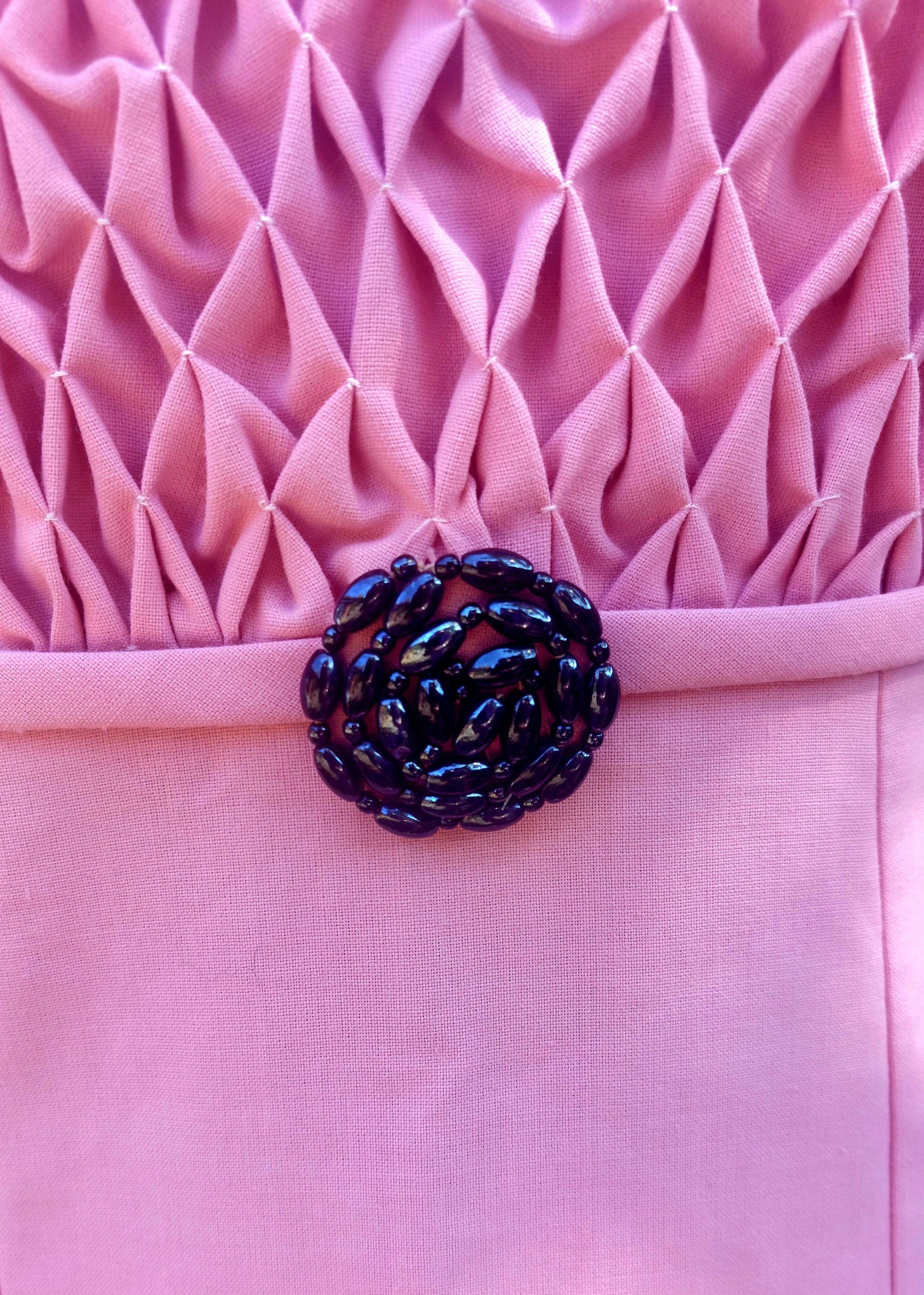 Sleeveless dress with lattice type ruching on the front bodice with a slight stretch. Sew in belt with a black beaded rosette which sits under the bust. Slight flare to the skirt with a split up the left side. Zip to rear. Quite thick, stiff material with lining to the front bodice.